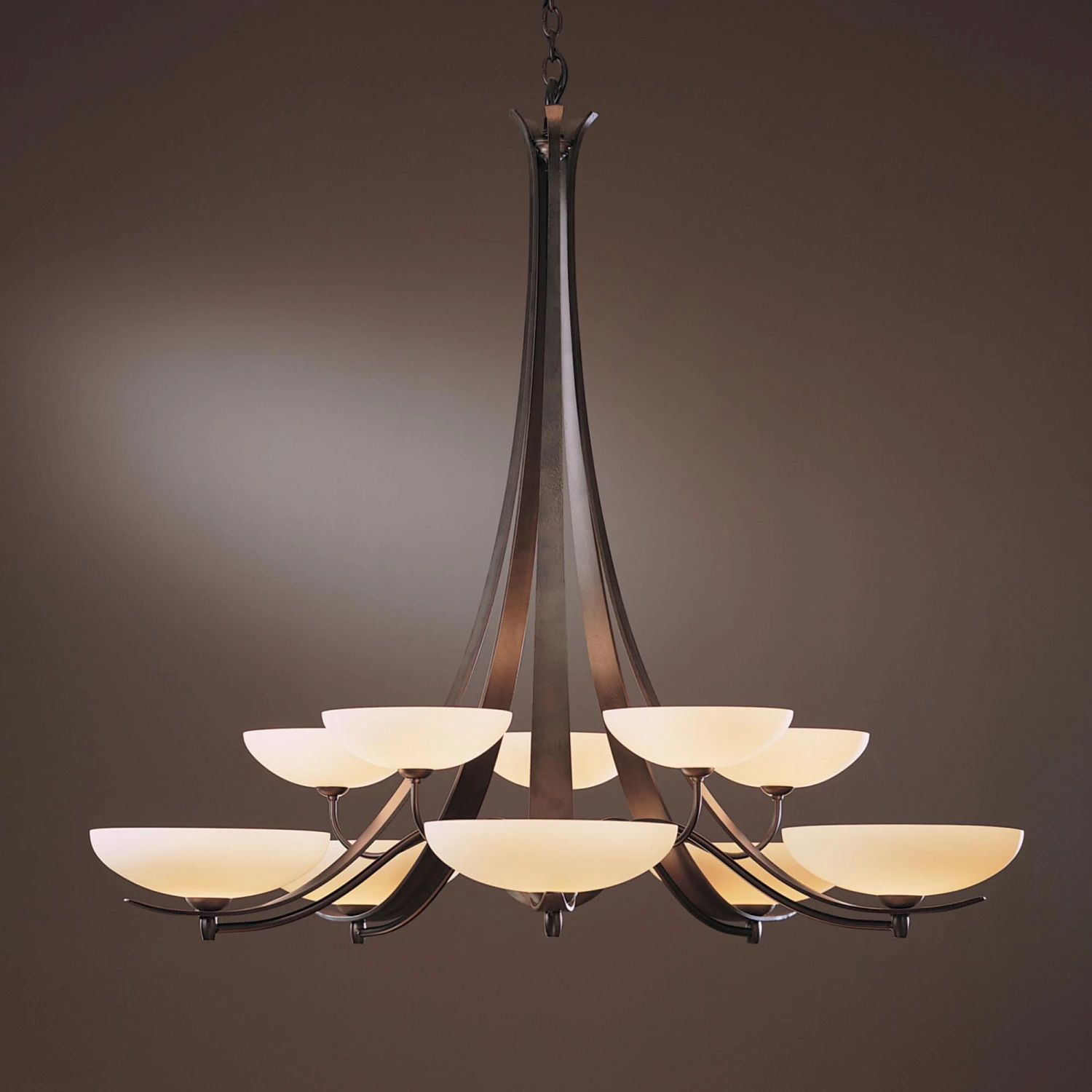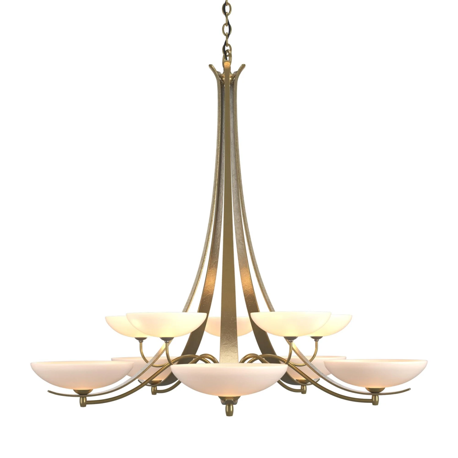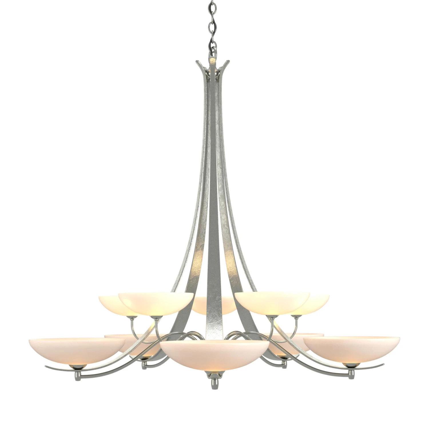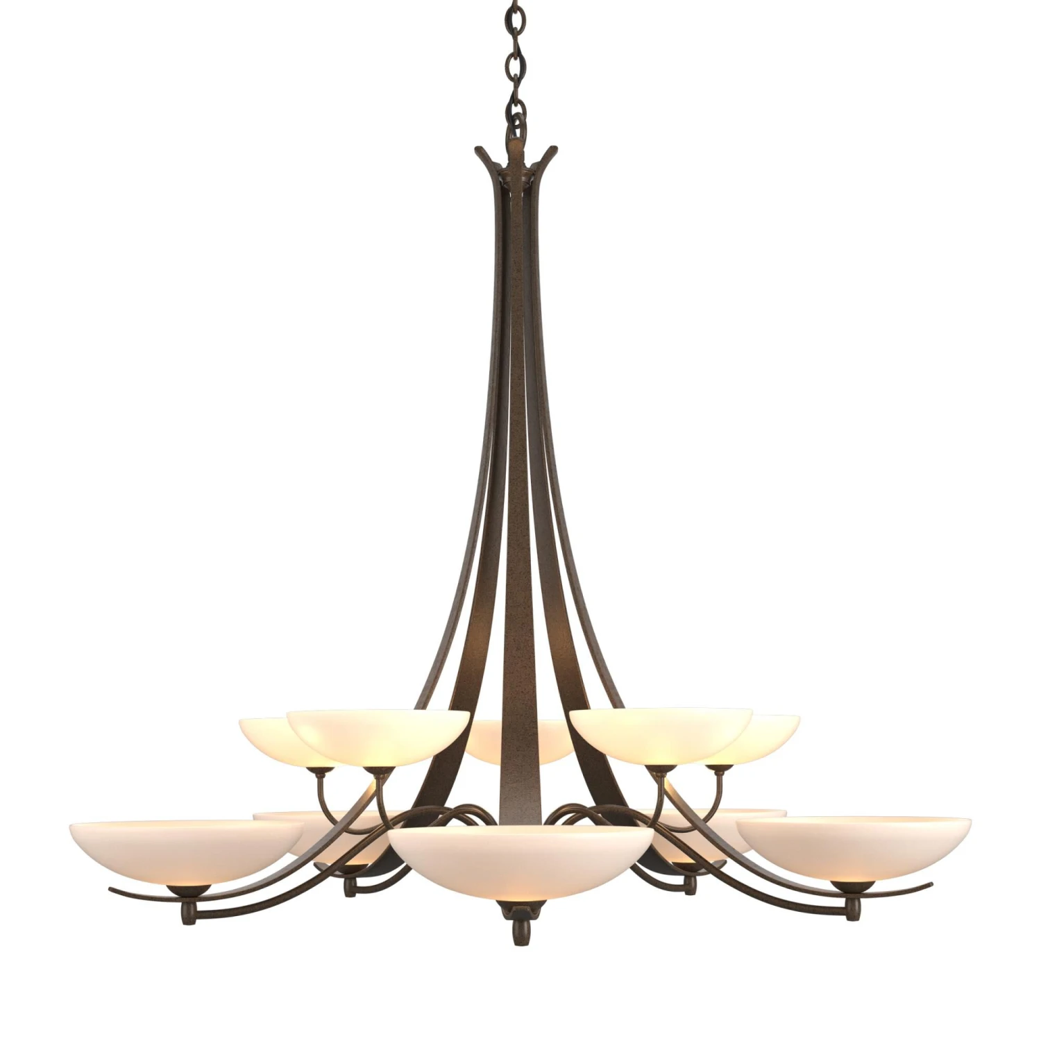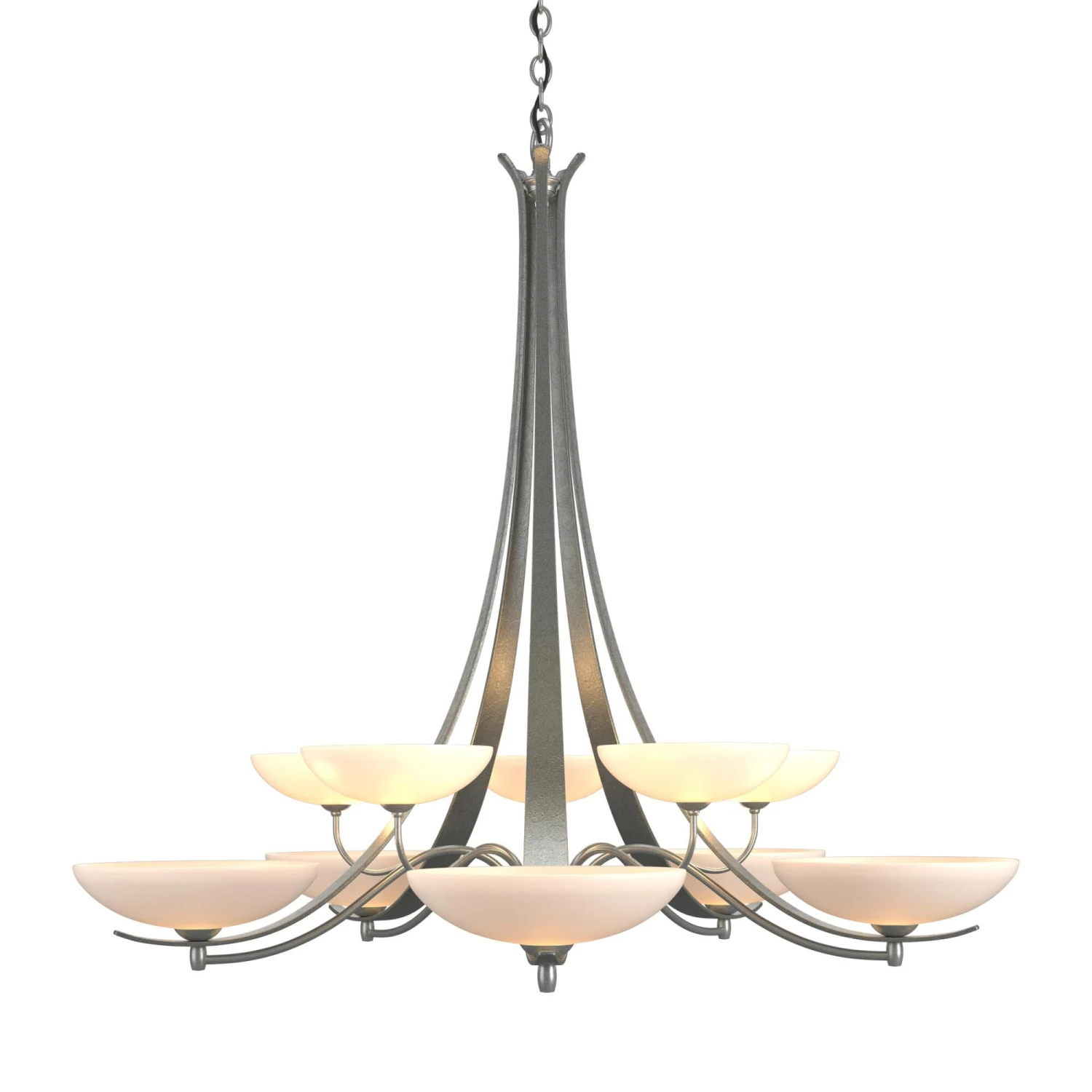 The hand-worked ribbons of steel paired with elegant glass bowls give this design a transitional twist. Delicately curved steel tubes link to each of the 10 lights on this two-tier chandelier. Aegis is a beautiful addition to a range of design styles. All Hubbardton Forge products are hand-crafted to last one at a time in Vermont and backed by a Lifetime Limited Warranty.
