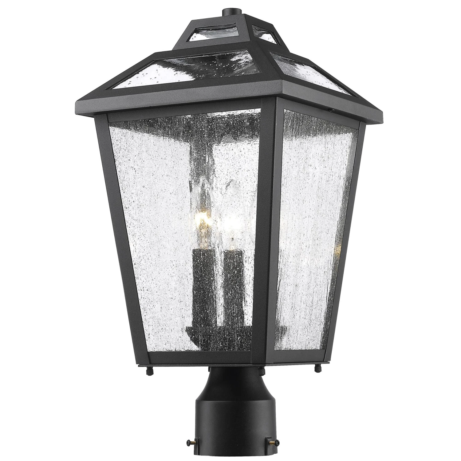 The Bayland family features clear seedy glass set against its black colored frame. The multi stepped top crowns this elegant fixture. The fixtures are constructed high quality cast aluminum.