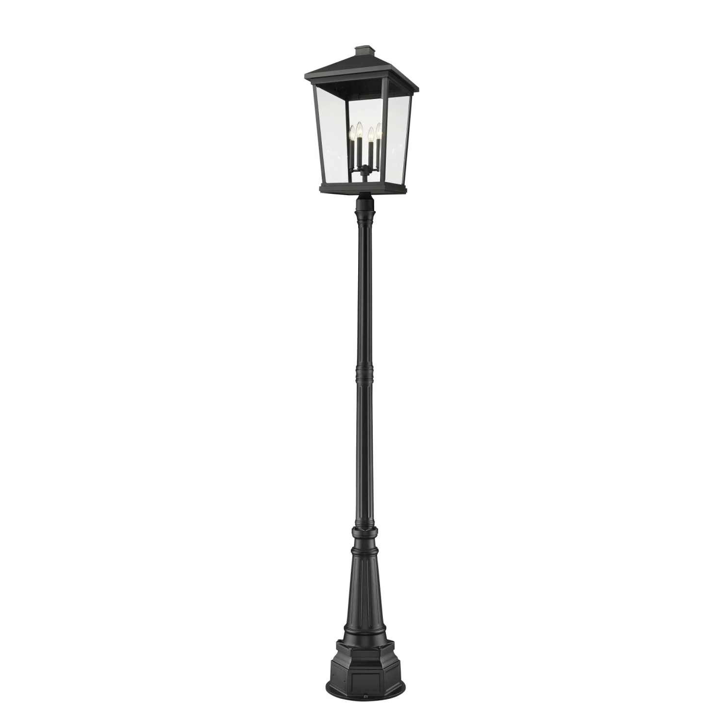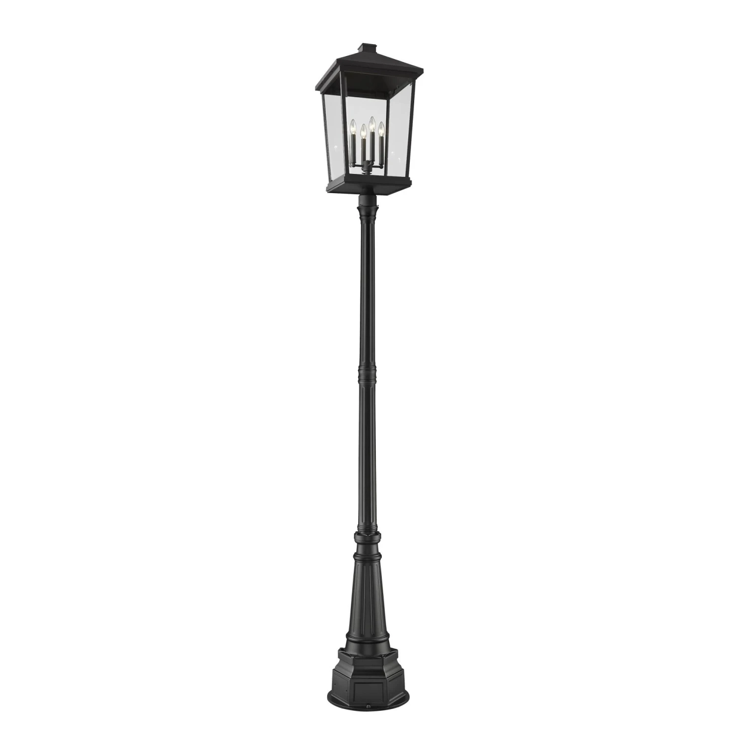 Custom crafting delivers a sophisticated village-inspired look to outdoor spaces, making this four-light outdoor post-mounted fixture from the Beacon collection a superb choice. Dress up a patio or walkway with a fixture crafted of matte black finish aluminum and clear beveled glass, with charming candelabra-style bulb mounts adding a romantic aesthetic. Nestled on an ornate, detail-oriented post, this light fixture adds elegance to any exterior space.