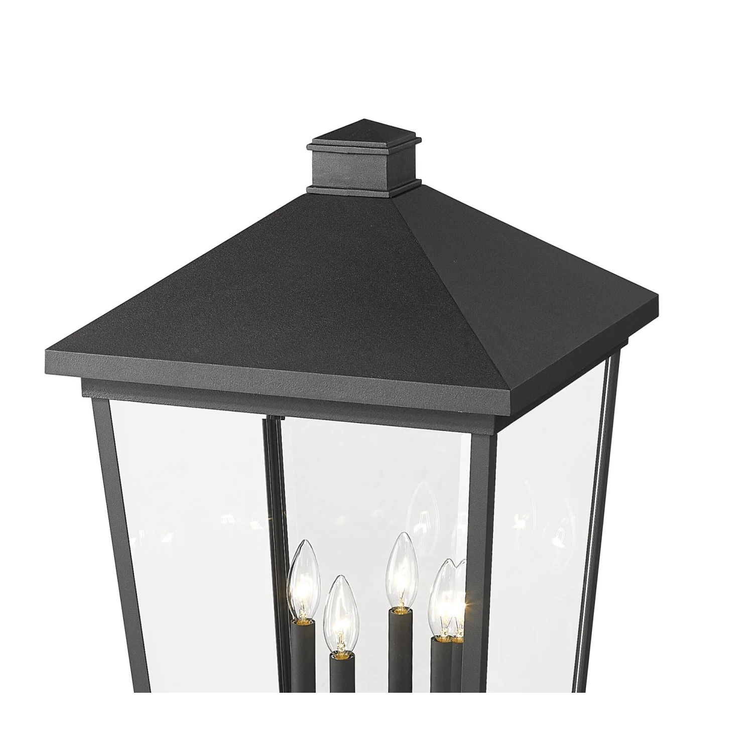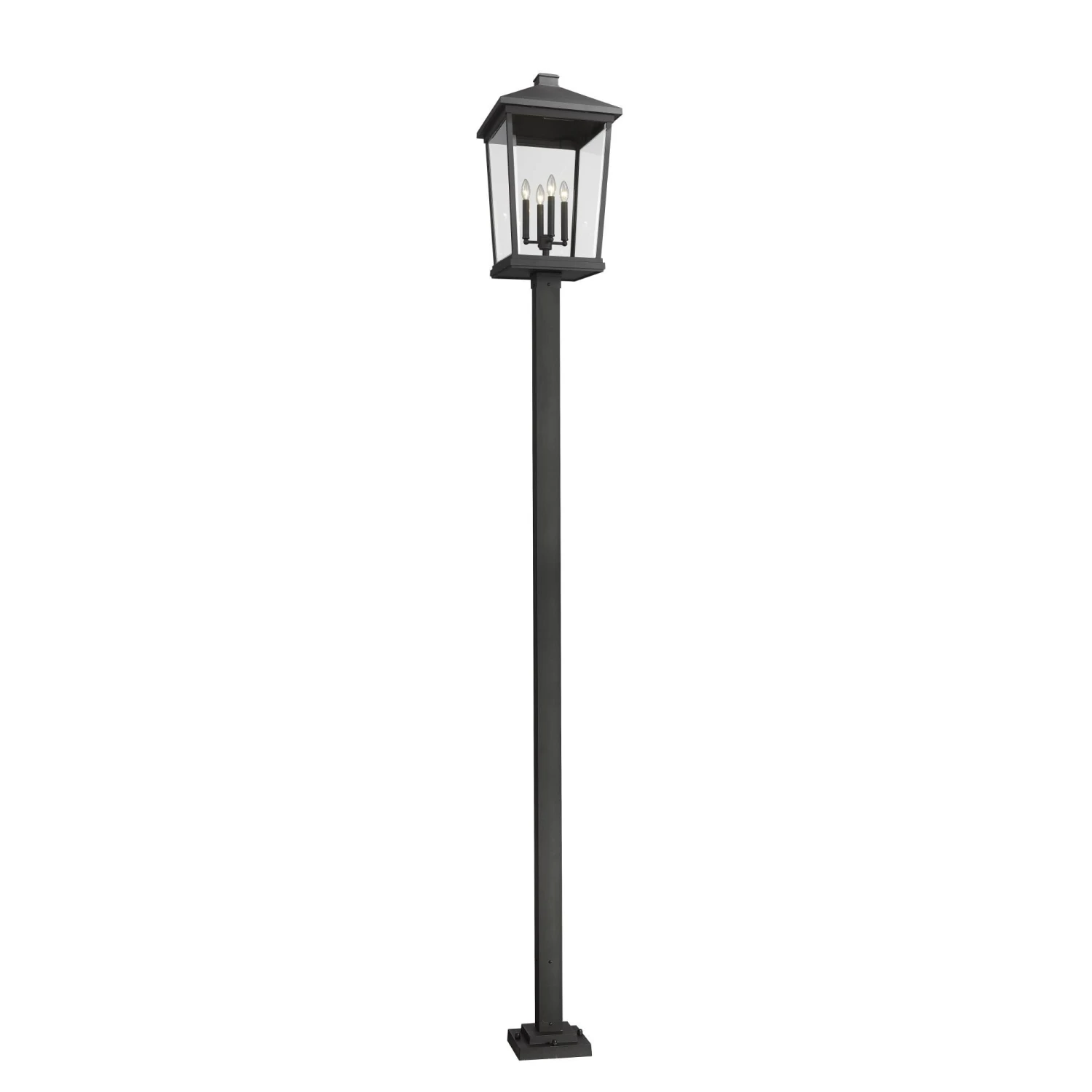 Keep it simple and classic with this four-light outdoor post mounted fixture from the Beacon collection. Transitional and modern motifs merge to create a sophisticated light and post from cool matte black finish aluminum. Clear beveled glass panels show through to candelabra-style bulb mounts, offering a tasteful design-forward look with village-influenced charm.