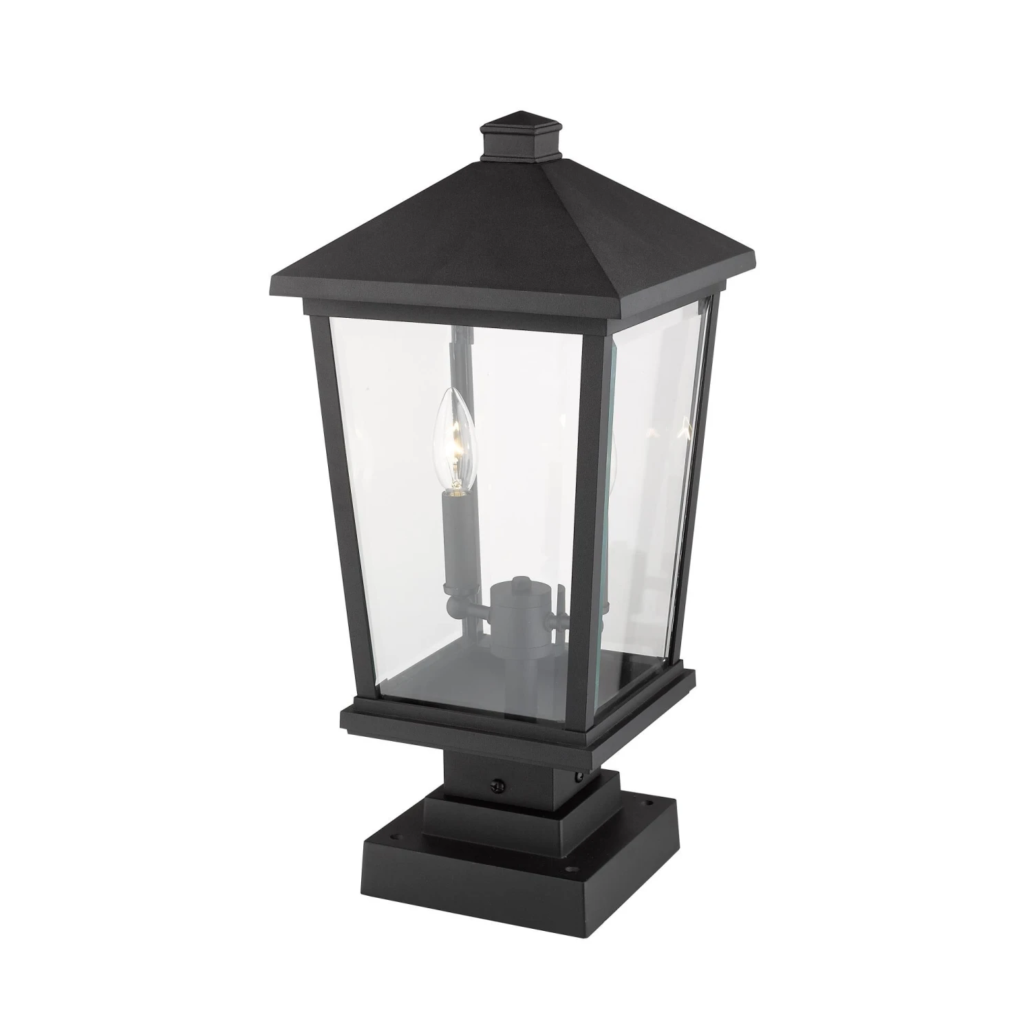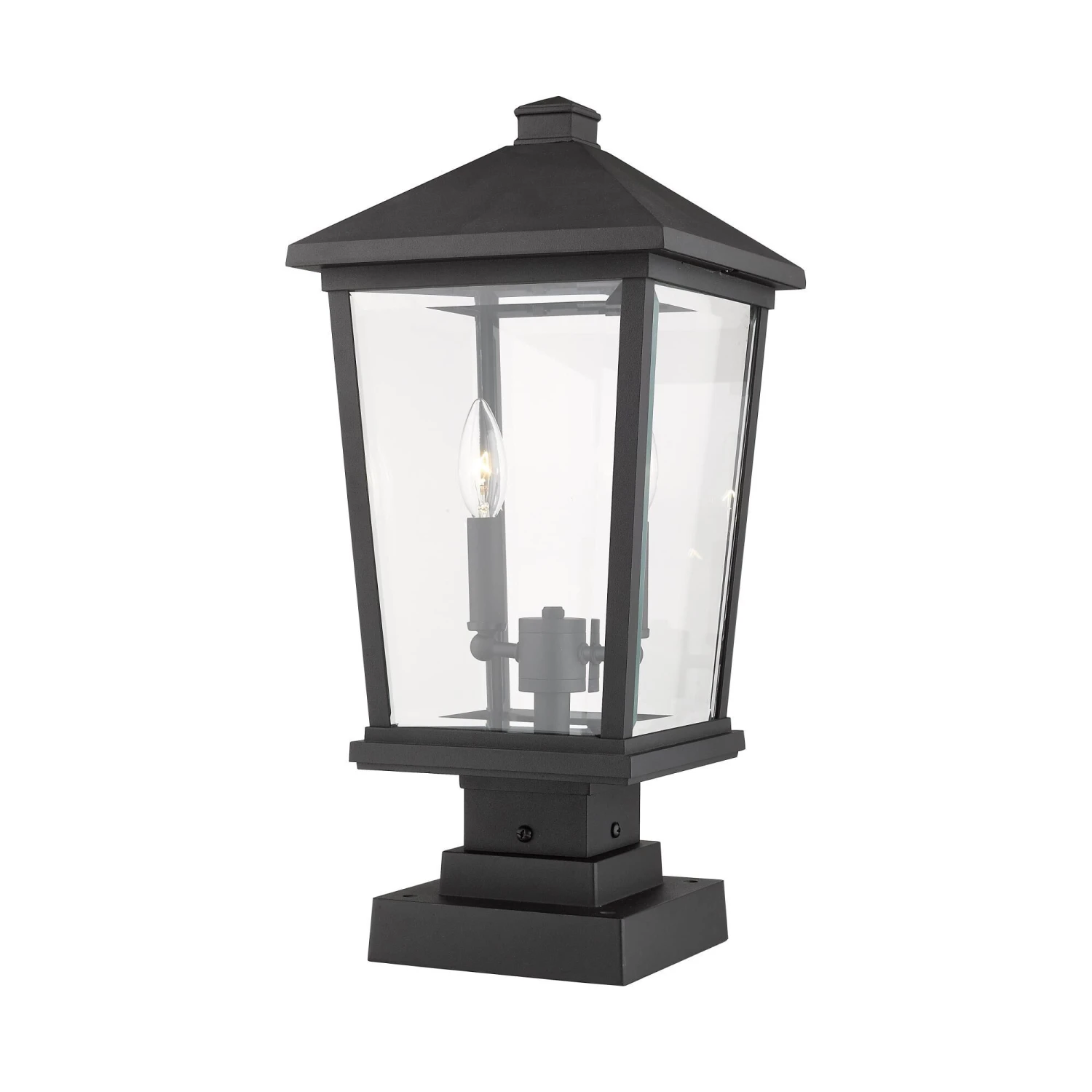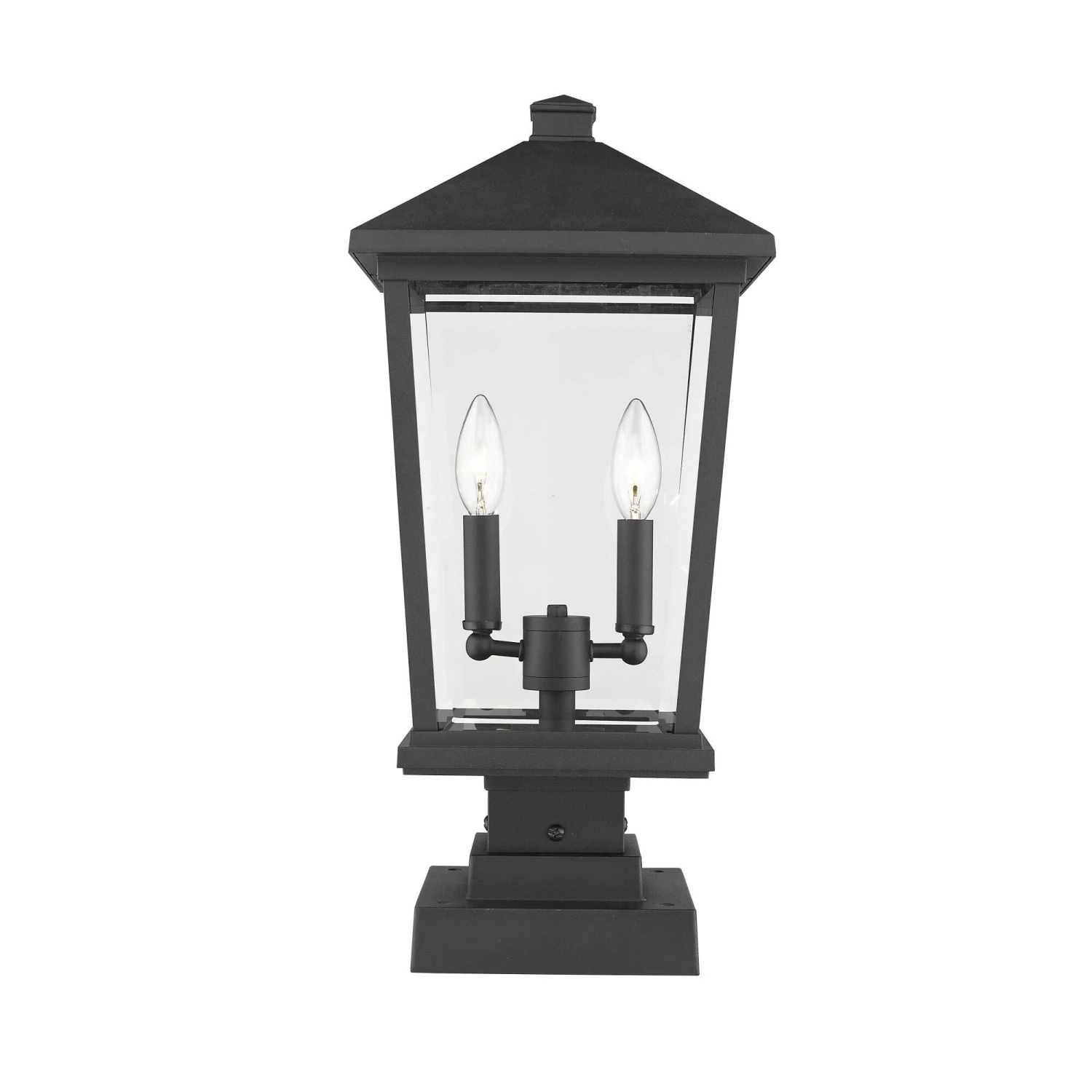 Add a decorative aesthetic to an exterior garden or walkway. Mounted to a post, this black finish outdoor post light features a charming village design with a clearly visible two-light candelabra bulb base.