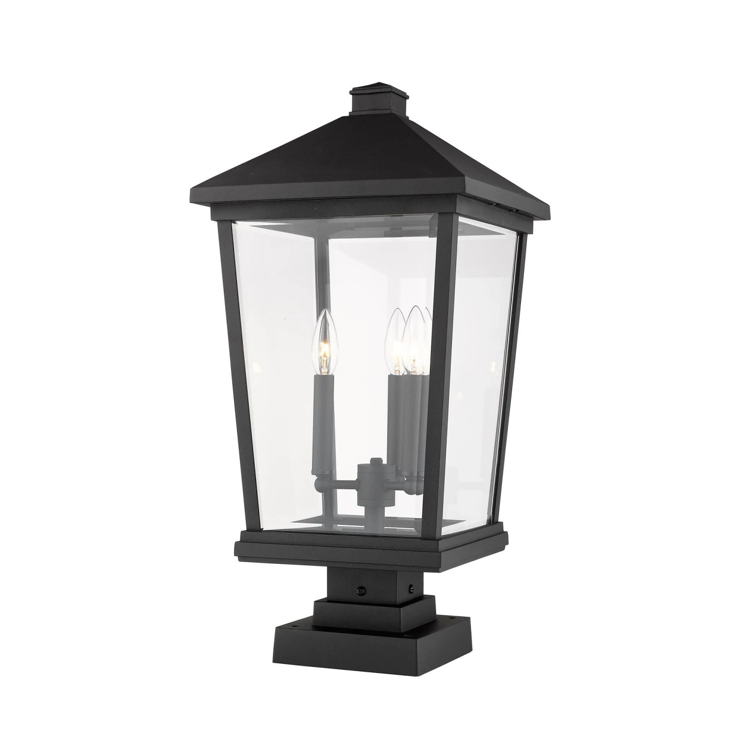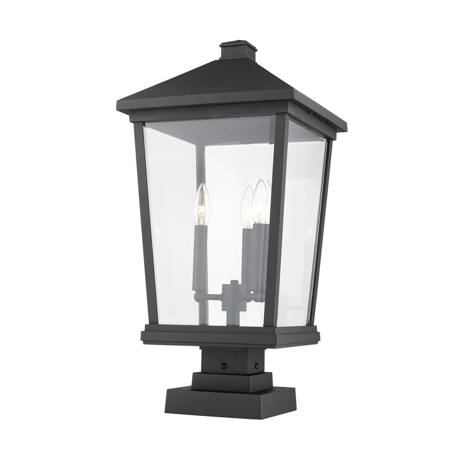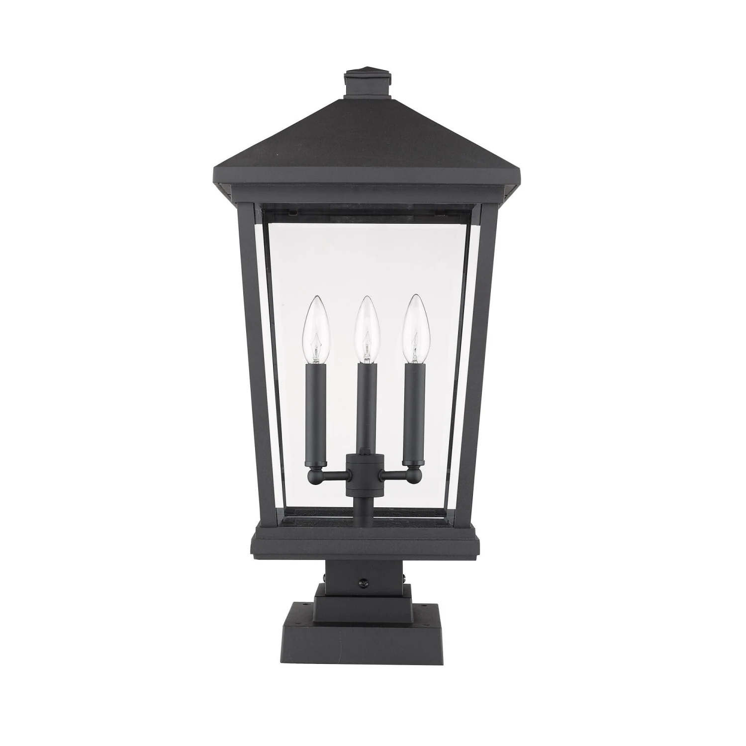 Light up a custom garden or walkway with the stylish look of this three-light outdoor post light. A bold black finish frame hosts three candelabra bulb mounts that deliver a charming village feel.