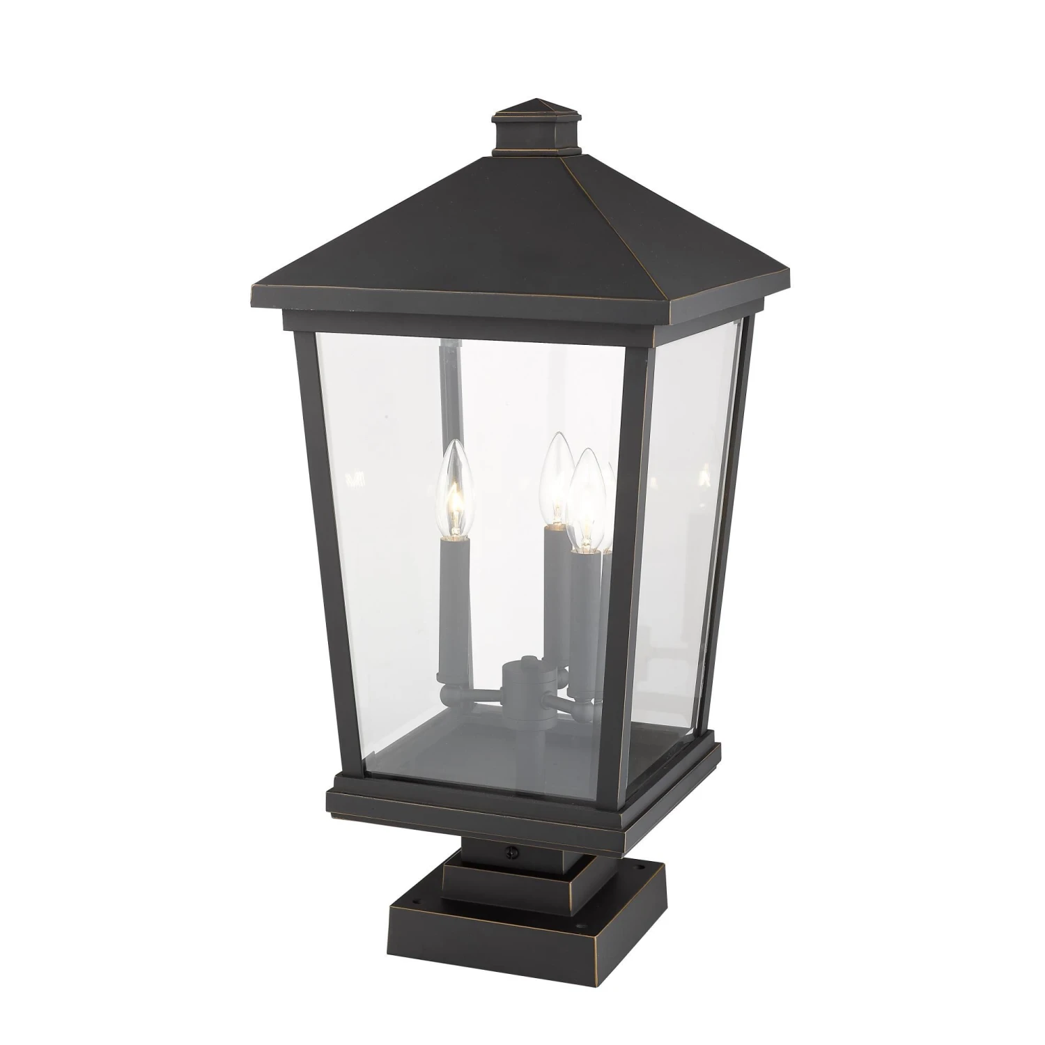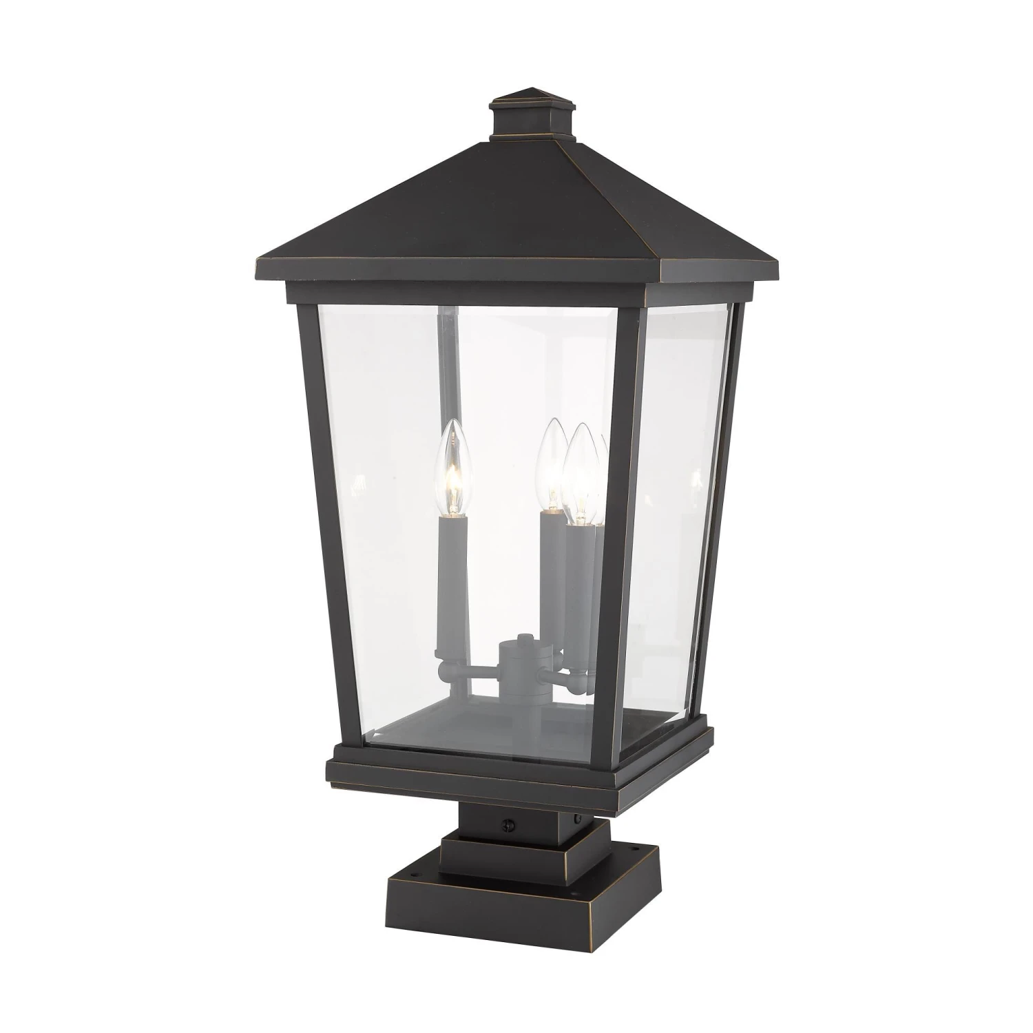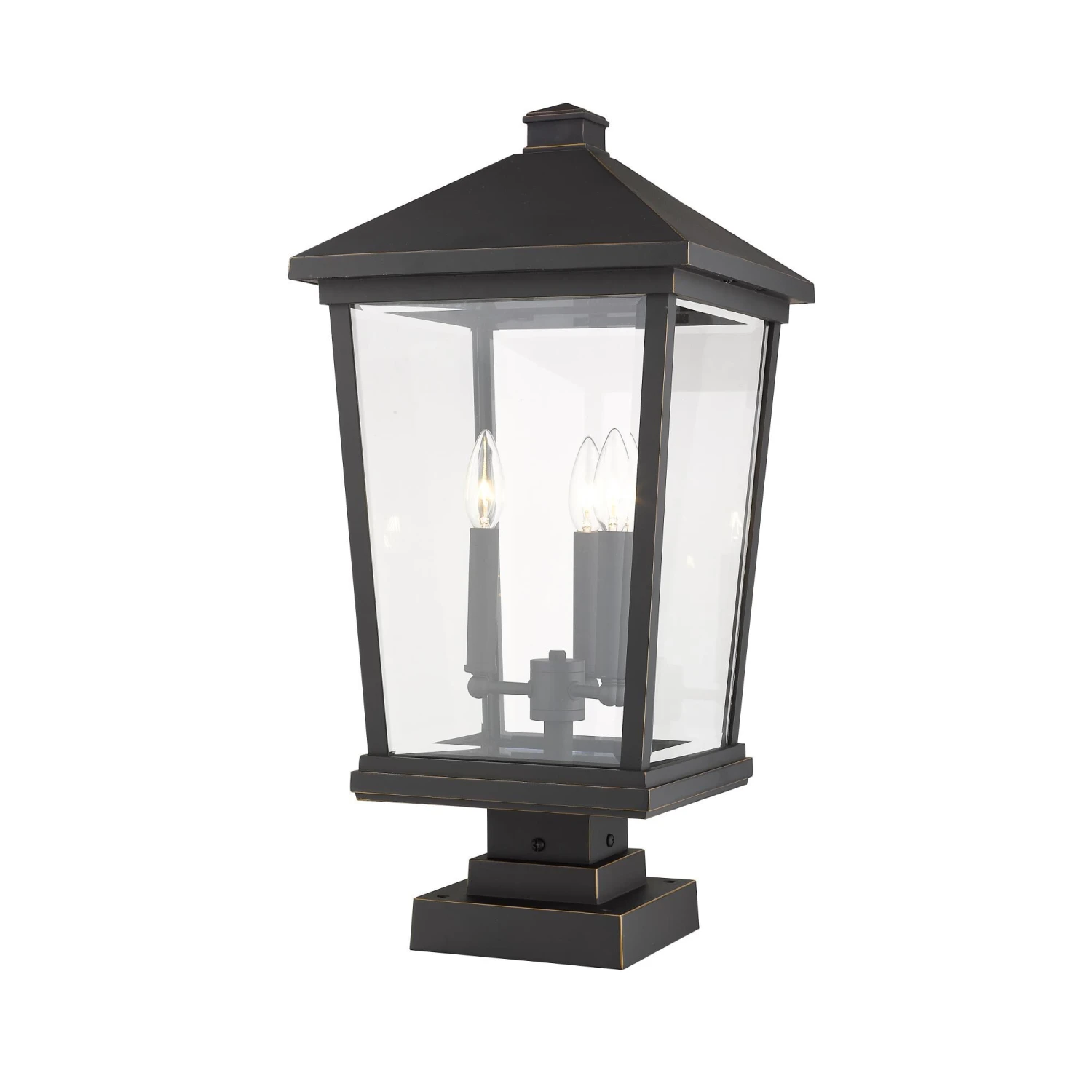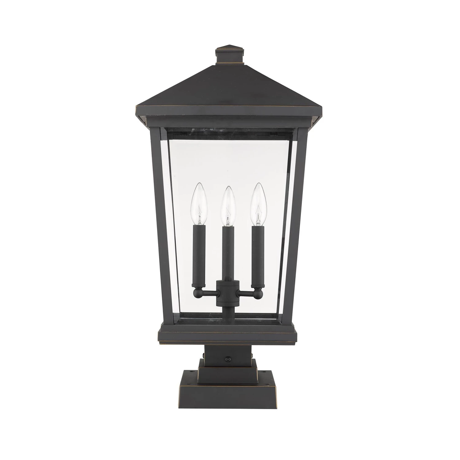 Light up a custom garden or walkway with the stylish look of this three-light outdoor post light. A bold black finish frame hosts three candelabra bulb mounts that deliver a charming village feel.