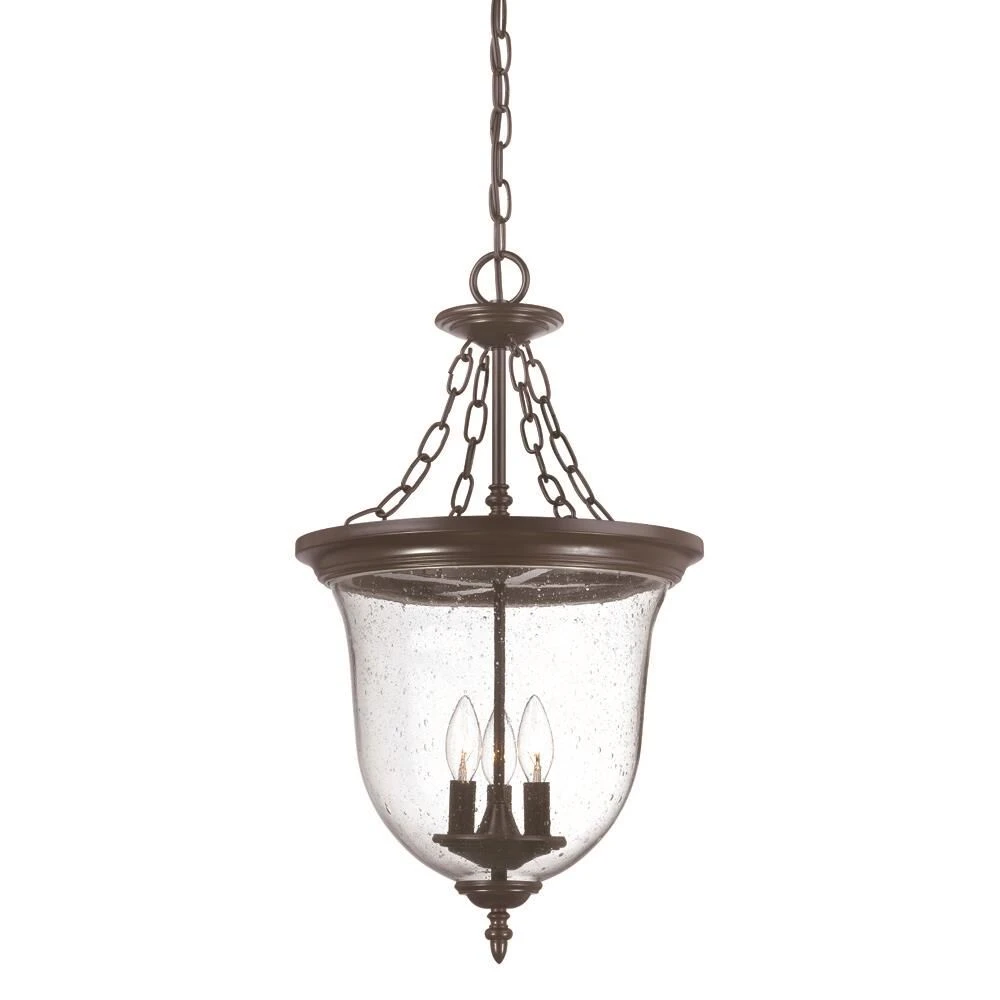 The Belle collection reflects a vintage Early American design reminiscent of Williamsburg or New England. This fixture is made of durable powder-coated steel. It is a good choice for a covered porch ceiling. The seeded glass globe makes it elegant enough for interior use also.
