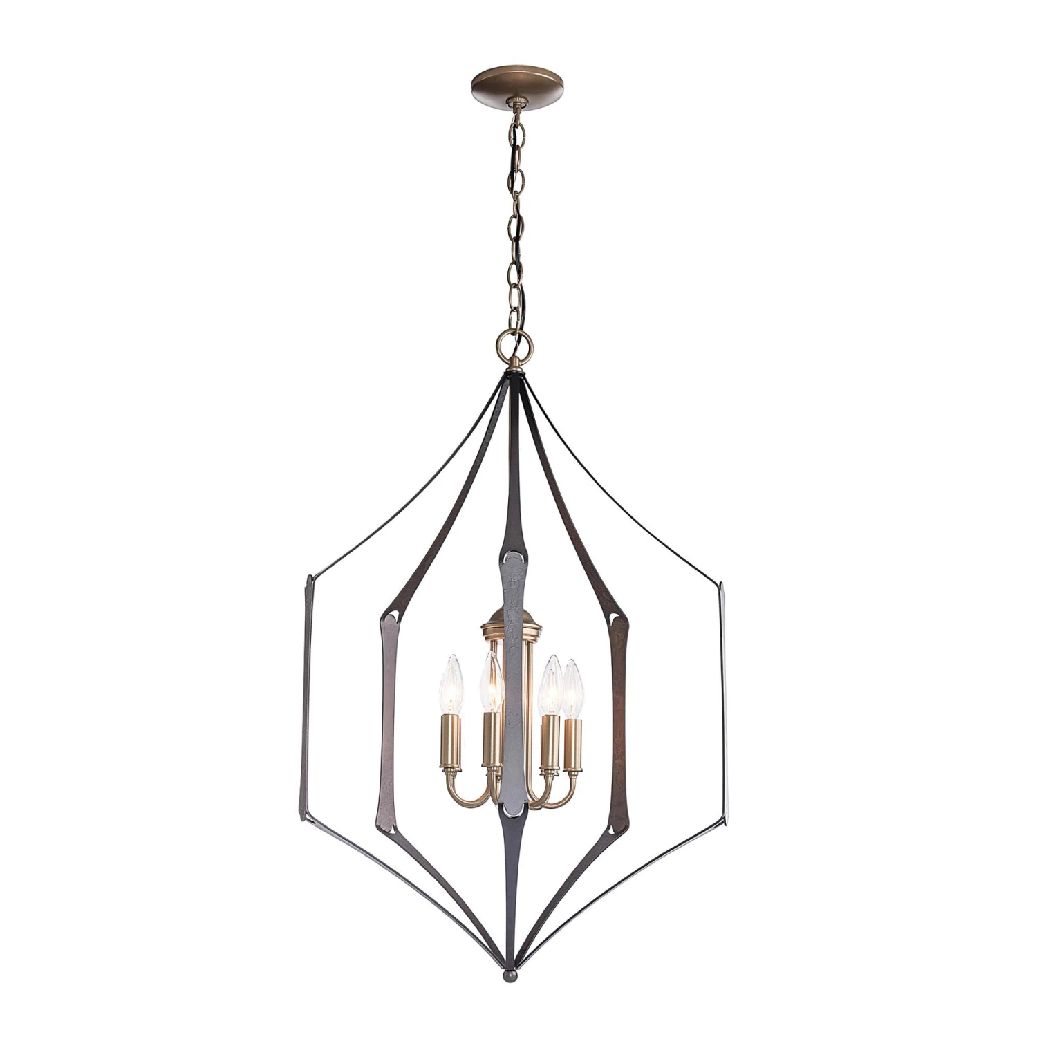 Chain-hung pendant with forged steel outer cage and candelabra bulb sockets. Choose a finish for the canopy, chain and light cluster. Choose an accent for the forged steel outer cage.