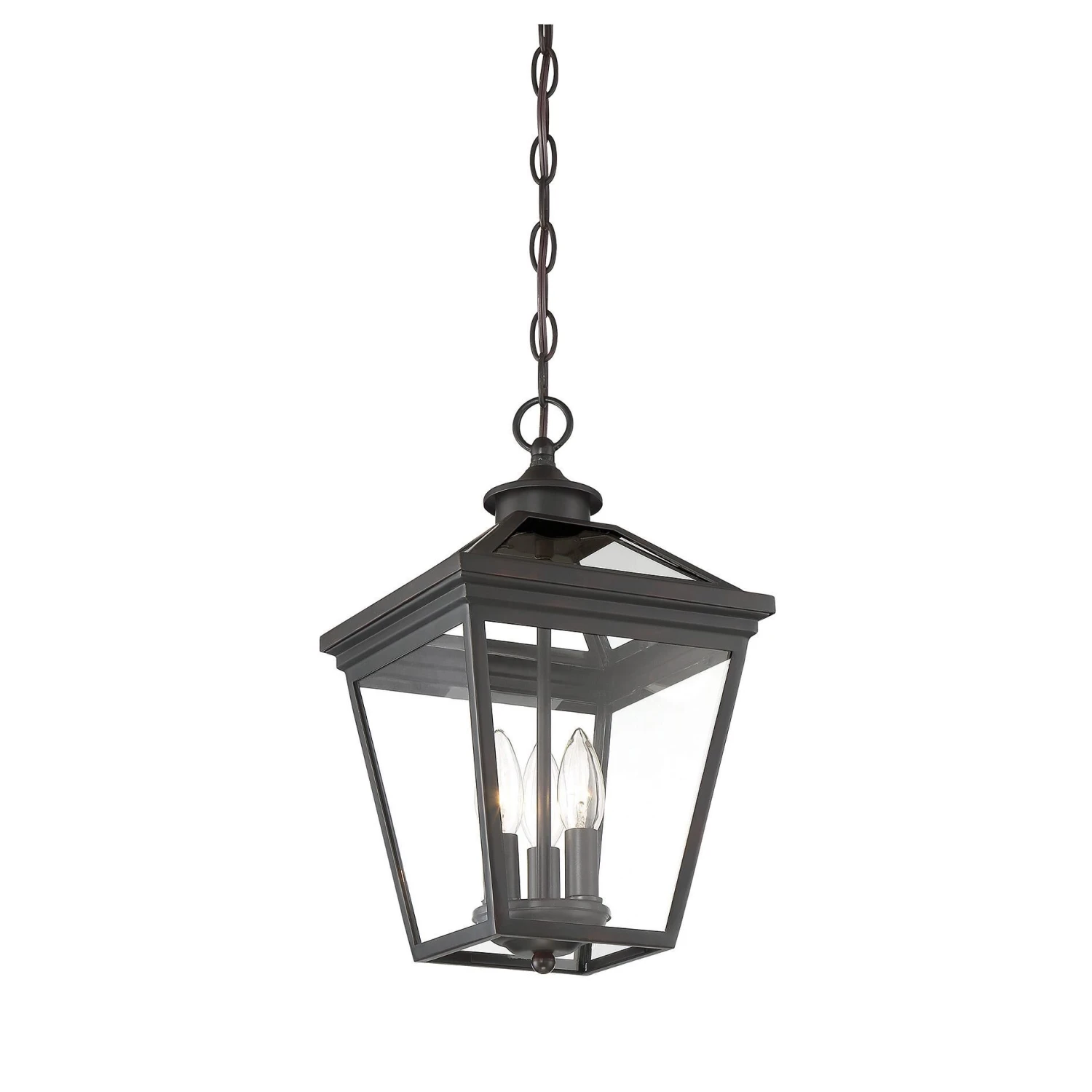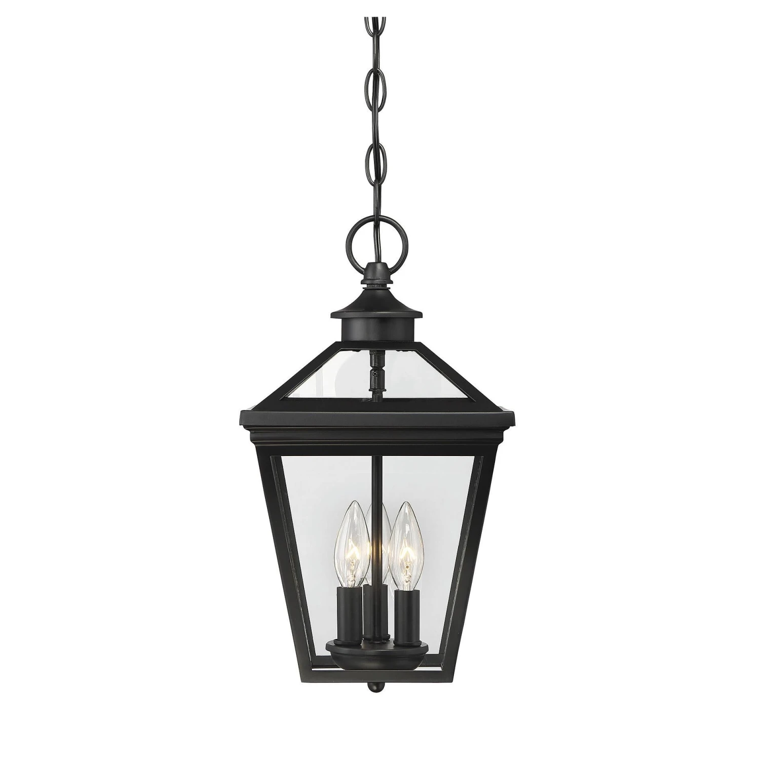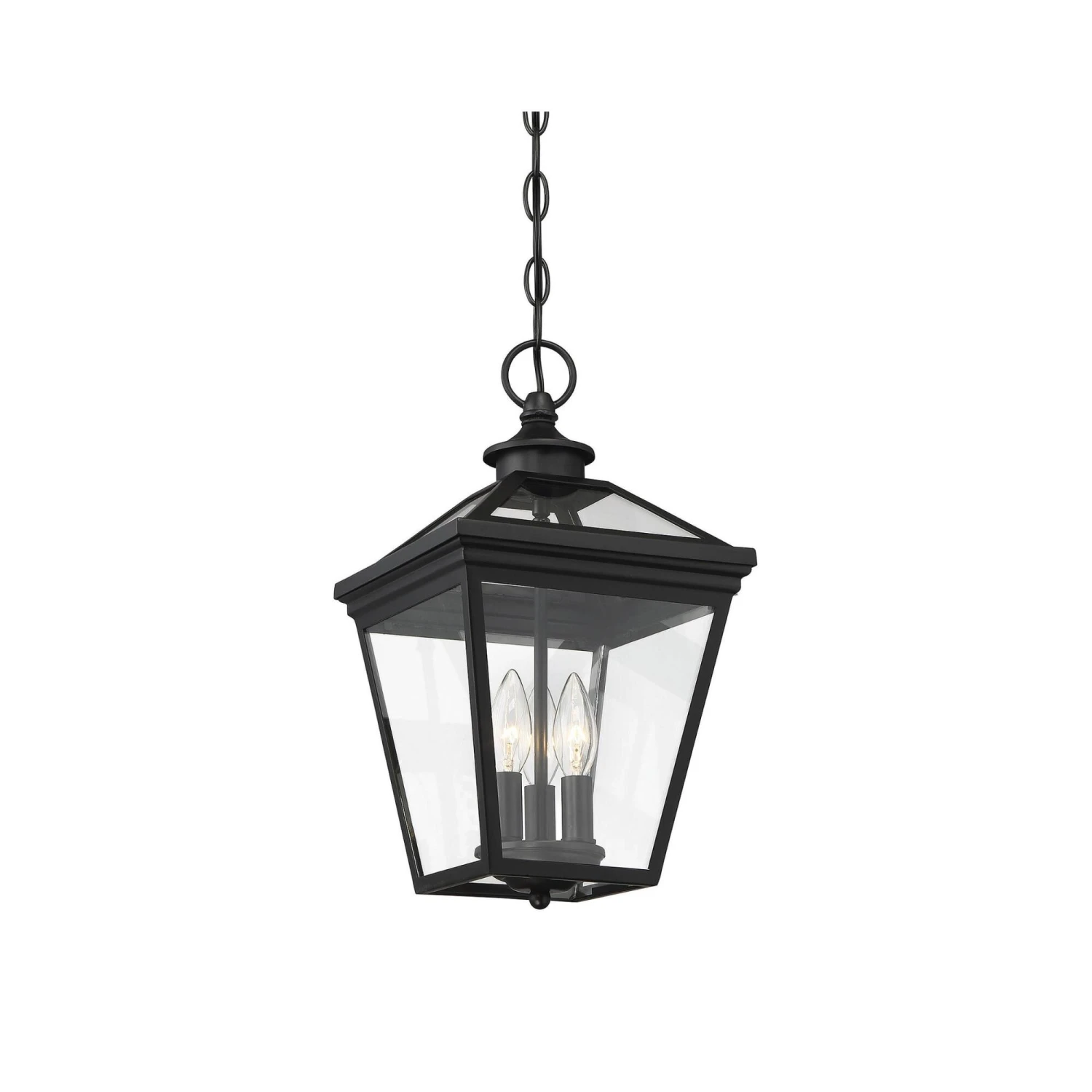 Brighten the exterior of your home and welcome your guests in style, with the Ellijay hanging lantern. The design mimics a vintage gas lantern, with a classic, tapered box shape and decorative top finial. A deep black finish looks terrific, and blends well with other hardware and architectural materials. Panes of clear glass fill all four side panels and the roof panels, too. Three 40W, C-style bulbs provide inviting and secure illumination. This lantern measures 19 wide and 15.75 high. Youll enjoy its timeless style and enhance the beauty of your property, whether on your porch, patio, sunroom, pergola, or hung from other ceilings in your outdoor living areas.