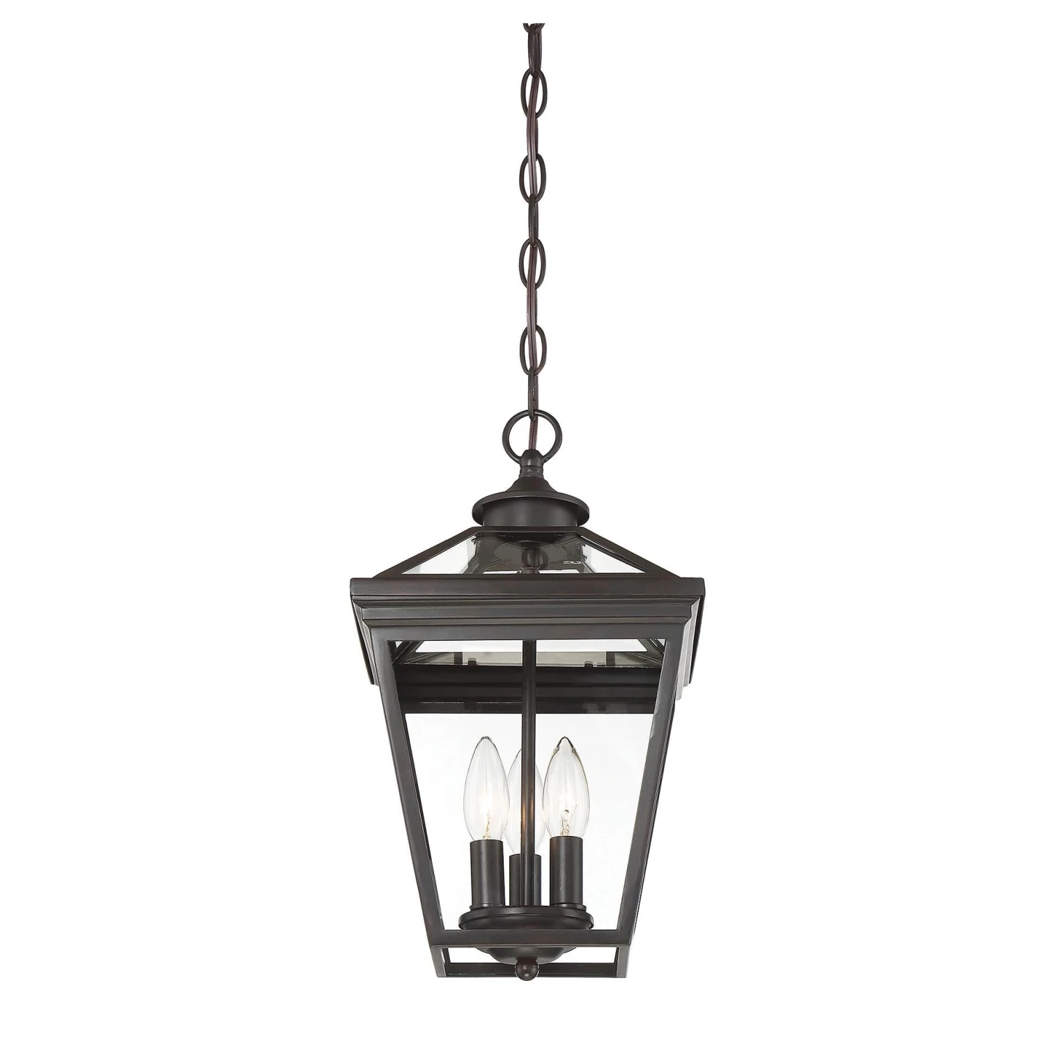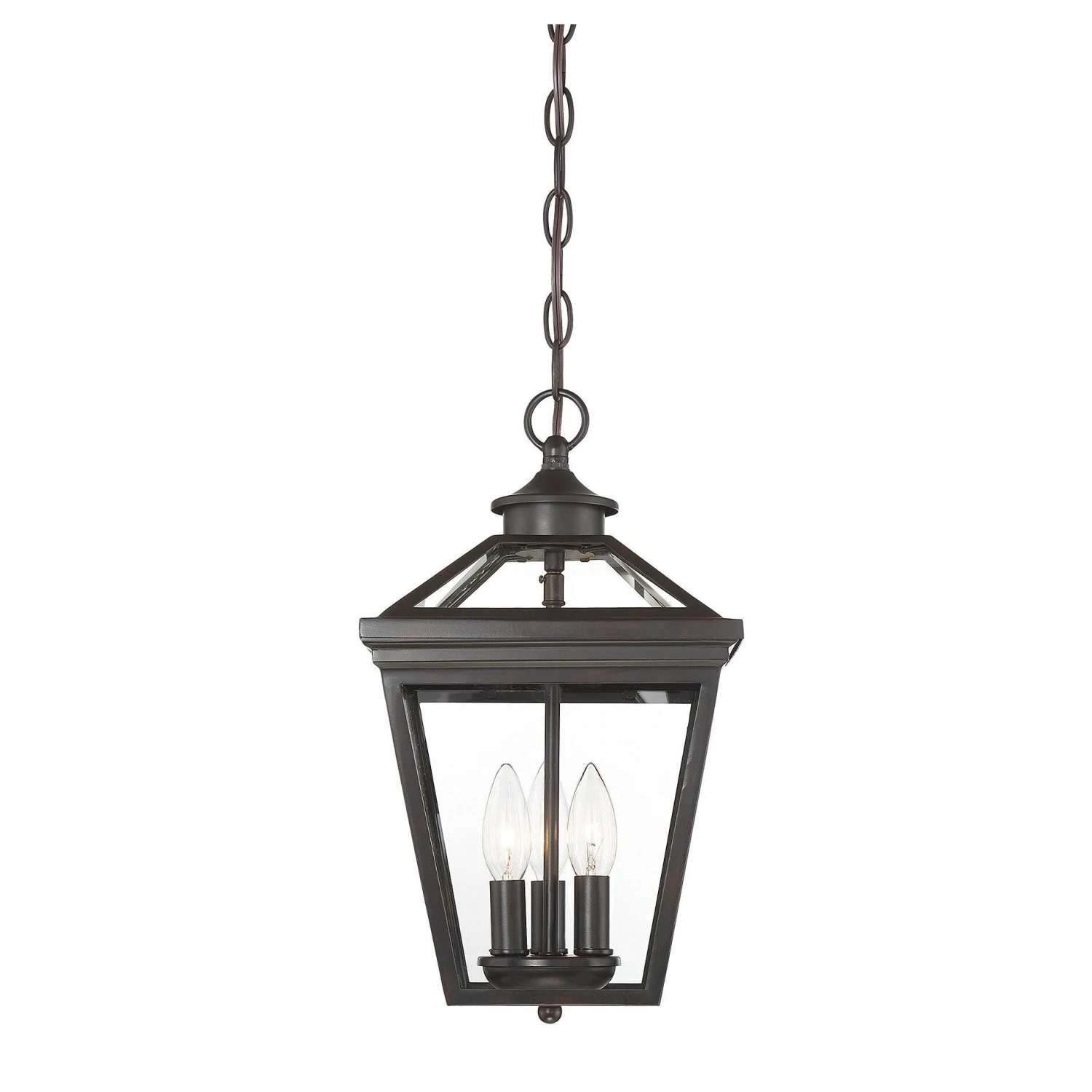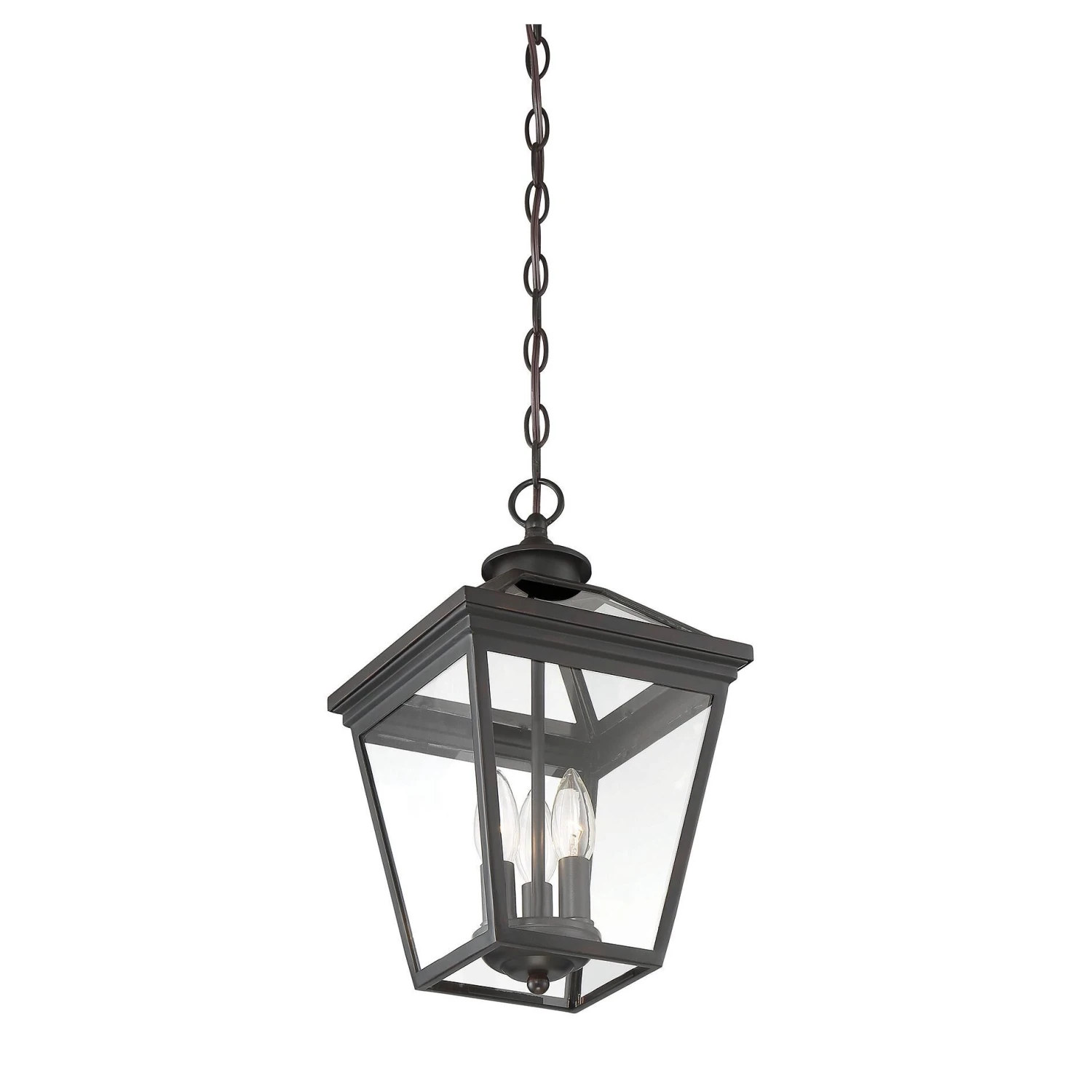 Brighten the exterior of your home and welcome your guests in style, with the Ellijay hanging lantern. The design mimics a vintage gas lantern, with a classic, tapered box shape and decorative top finial. A deep black finish looks terrific, and blends well with other hardware and architectural materials. Panes of clear glass fill all four side panels and the roof panels, too. Three 40W, C-style bulbs provide inviting and secure illumination. This lantern measures 19 wide and 15.75 high. Youll enjoy its timeless style and enhance the beauty of your property, whether on your porch, patio, sunroom, pergola, or hung from other ceilings in your outdoor living areas.