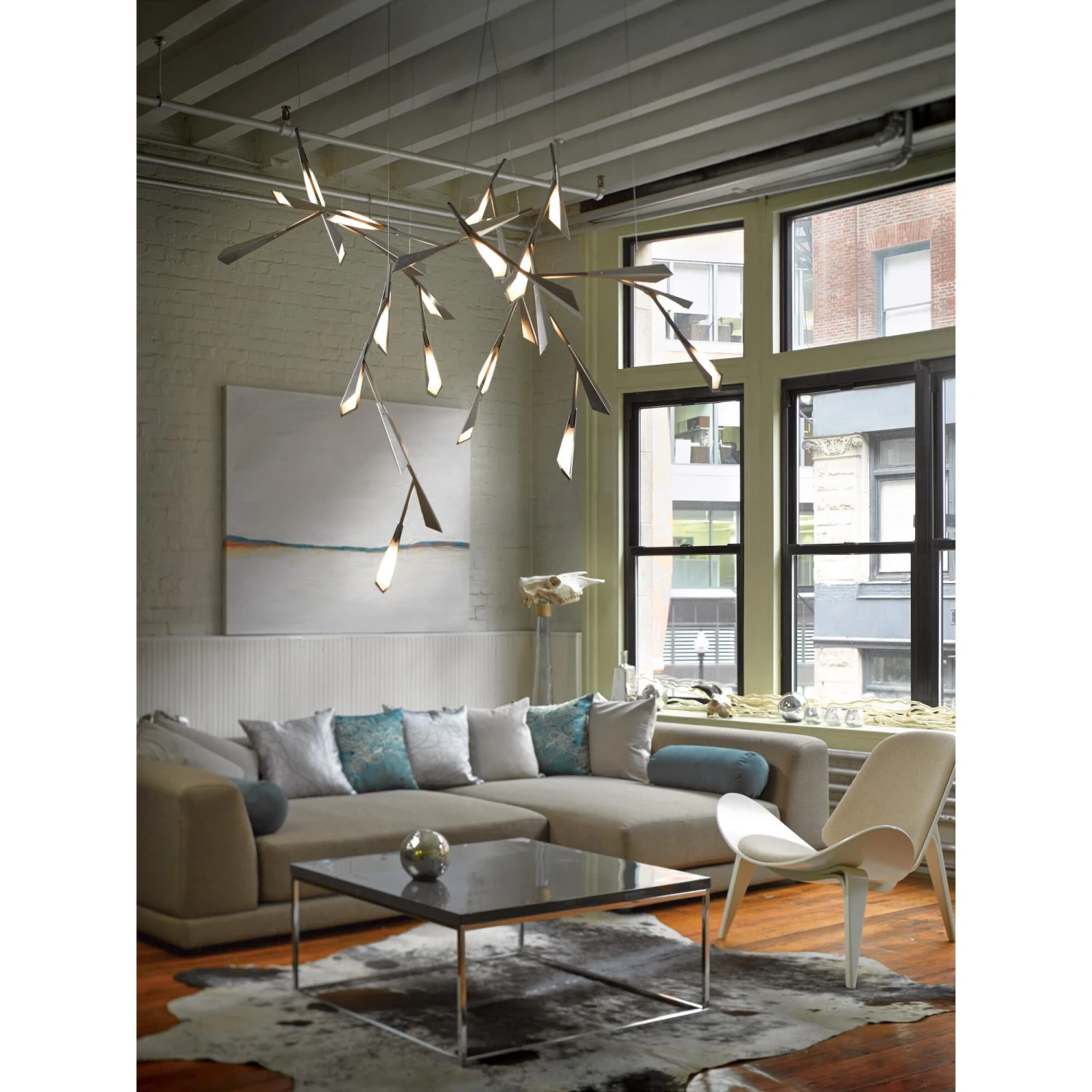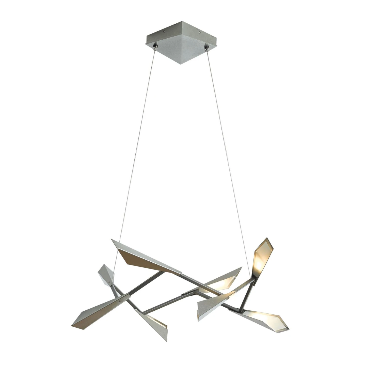 Adjustable pendant with aluminum shades and acrylic diffusers arranged in a circular configuration.