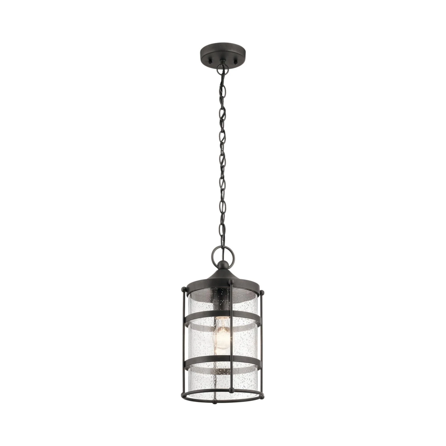 The 2-light outdoor pendant from the Mill Lane collection borrows its style from the classic lanterns found in America’s western and coastal towns at the turn of the century . Clear Seeded glass and anvil iron finish adds to the vintage look.