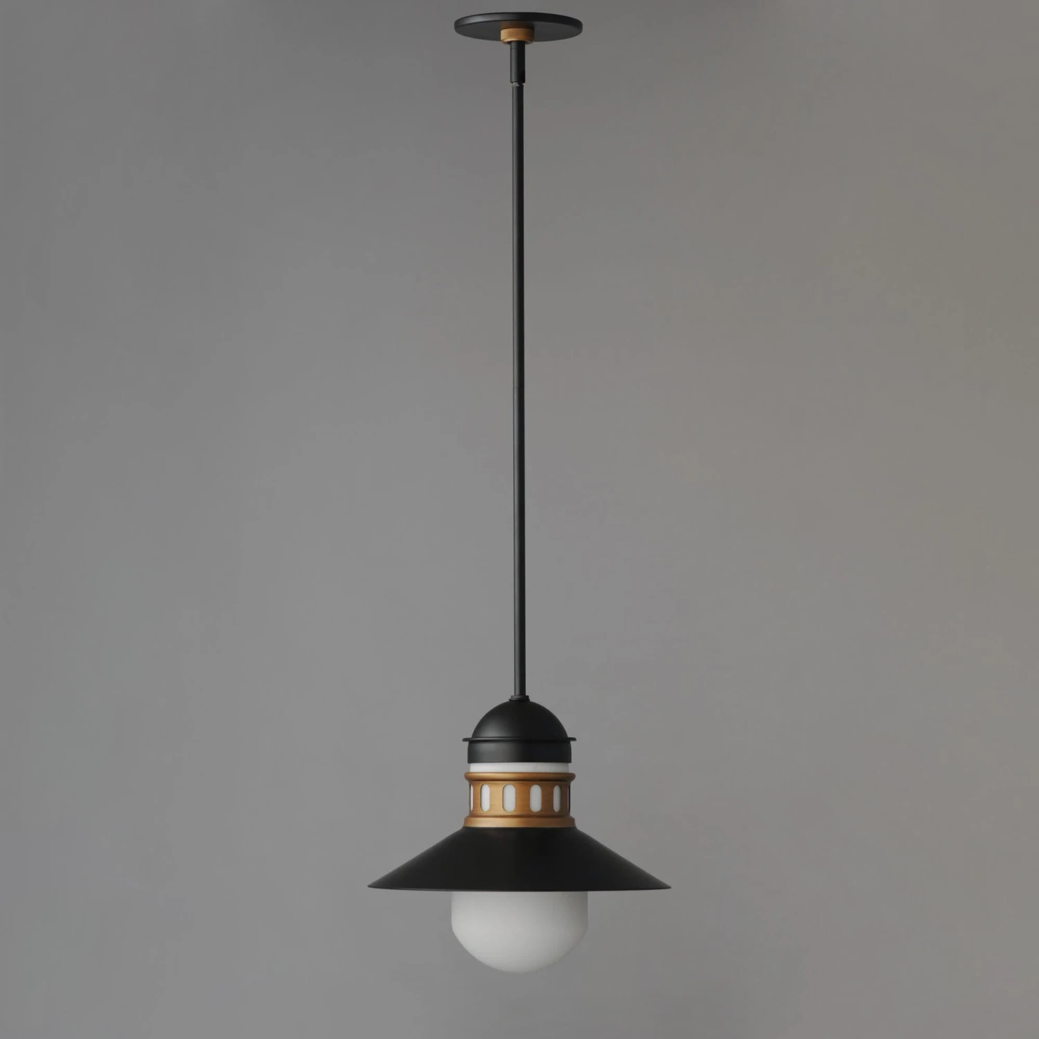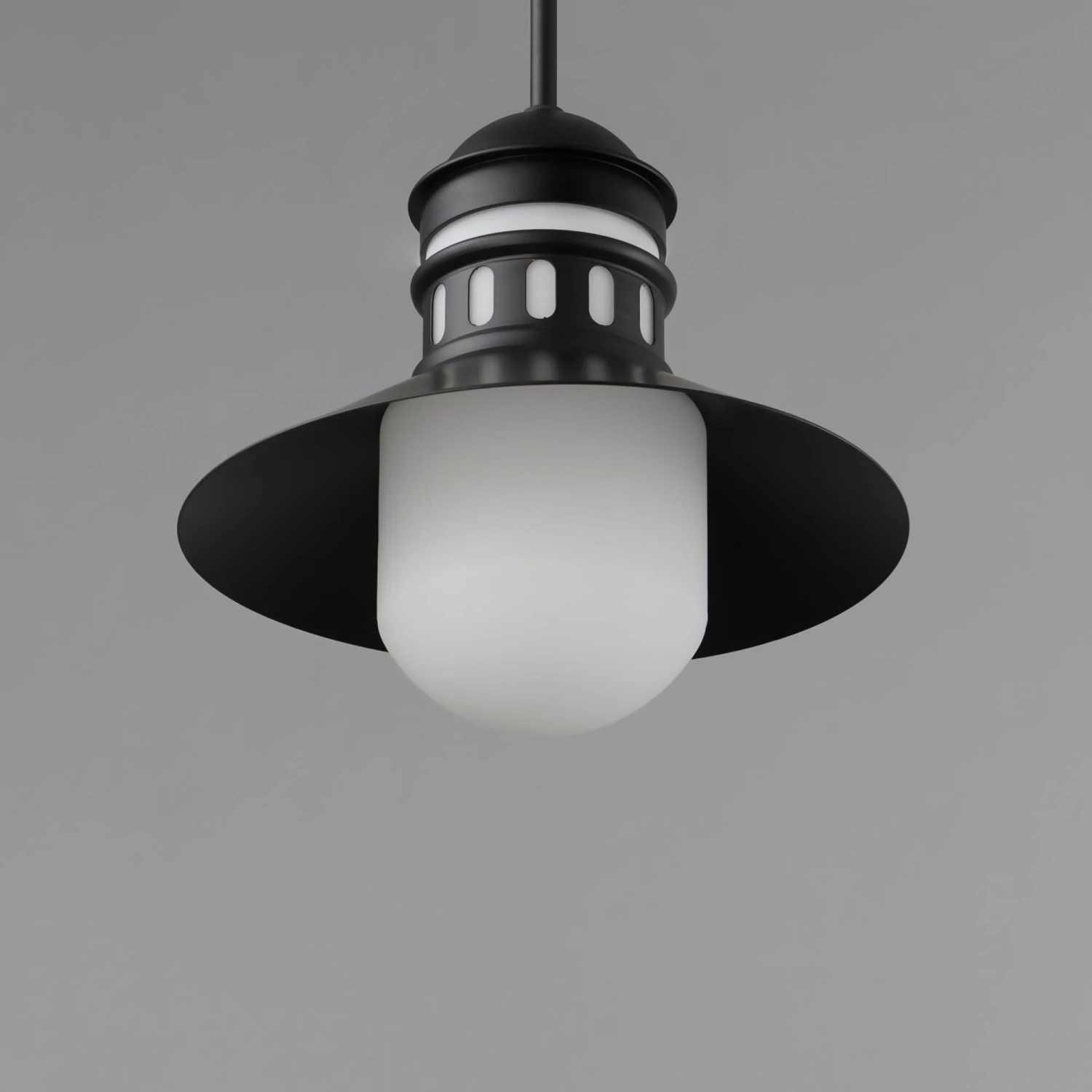 Coastally inspired, the wide brimmed aluminum spun shade on this series of outdoor rated sconces, pendants, and flush mounts features a tiered shade design. The ringed separation features a filigree of oval cut outs, whereby a single lamp illuminates the Satin White glass supporting it. The resulting light is dispersed both above and below the spun shade as well as through the patterned filigree. Both modern and classic homes can appreciate this classic design reimagined. The series is available either in Matte Black or a striking Two-Tone Black with Antique Brass.