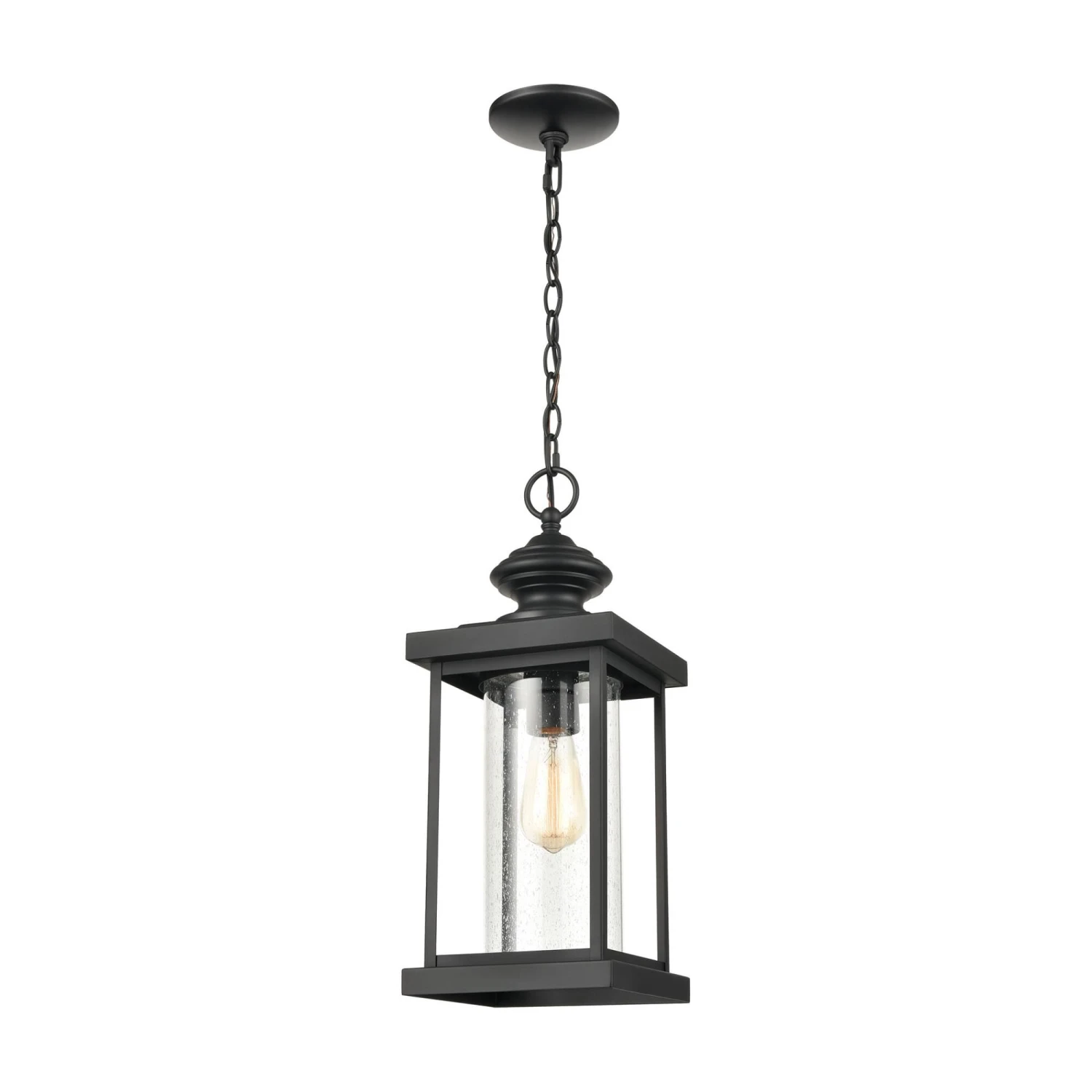 The Minersville Outdoor Pendant Features A Round Glass Within A Rectangular-shaped Frame. Finished In Matte Black With Antique Speckled Glass.
