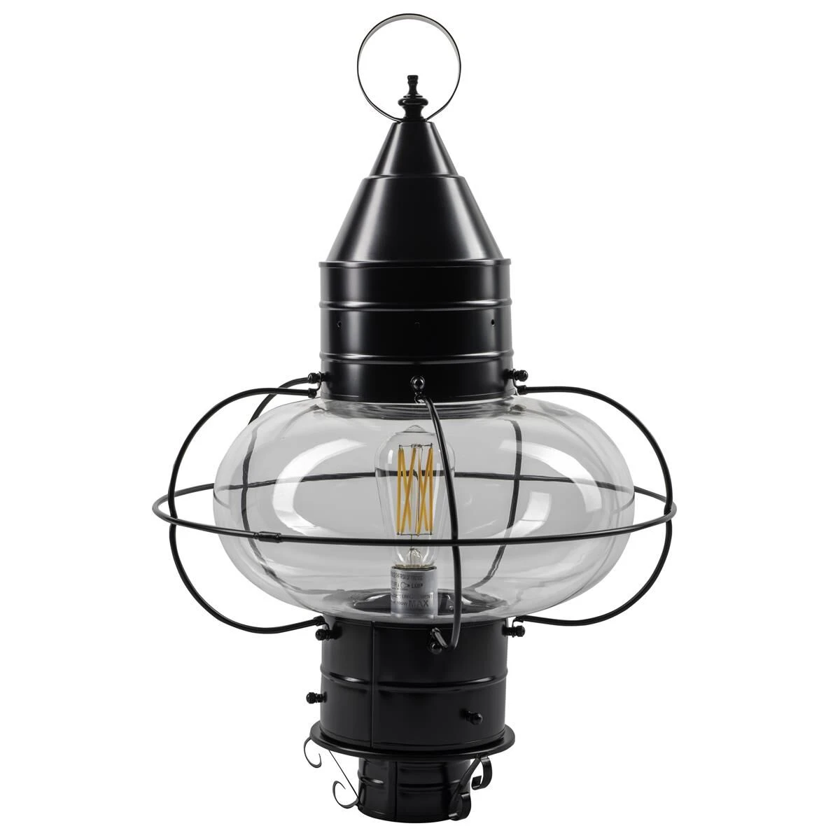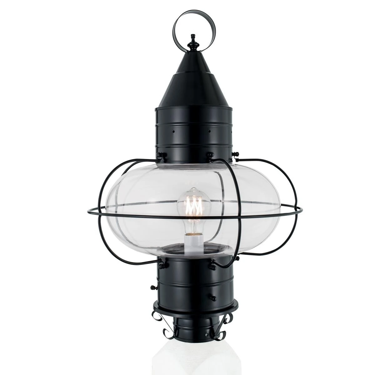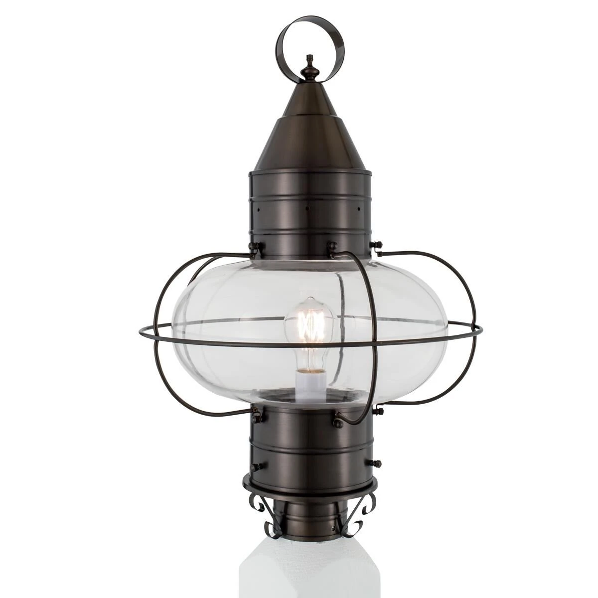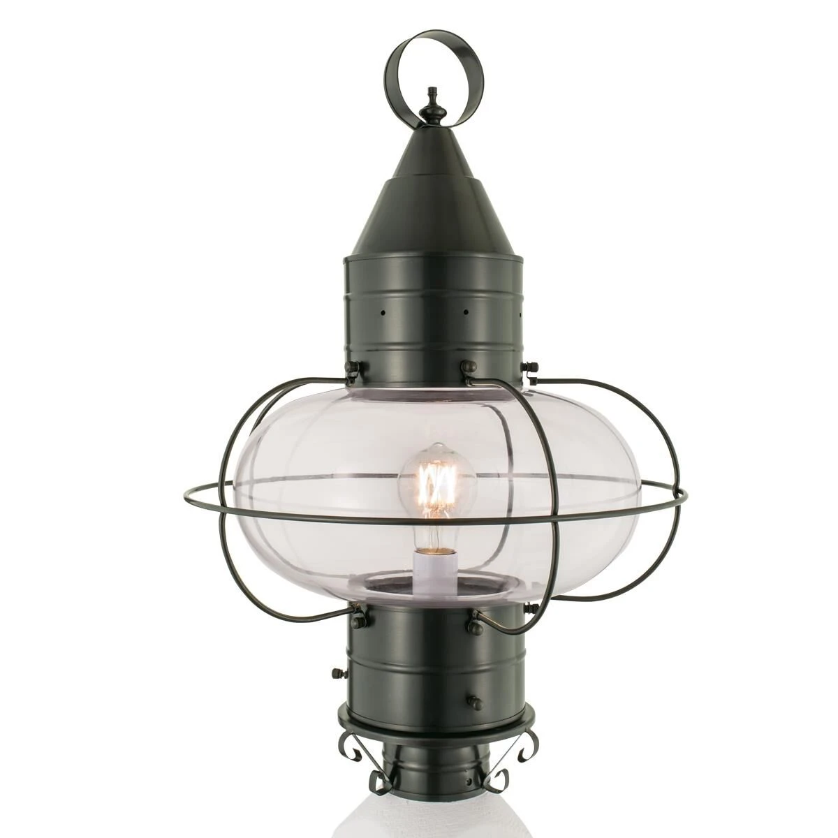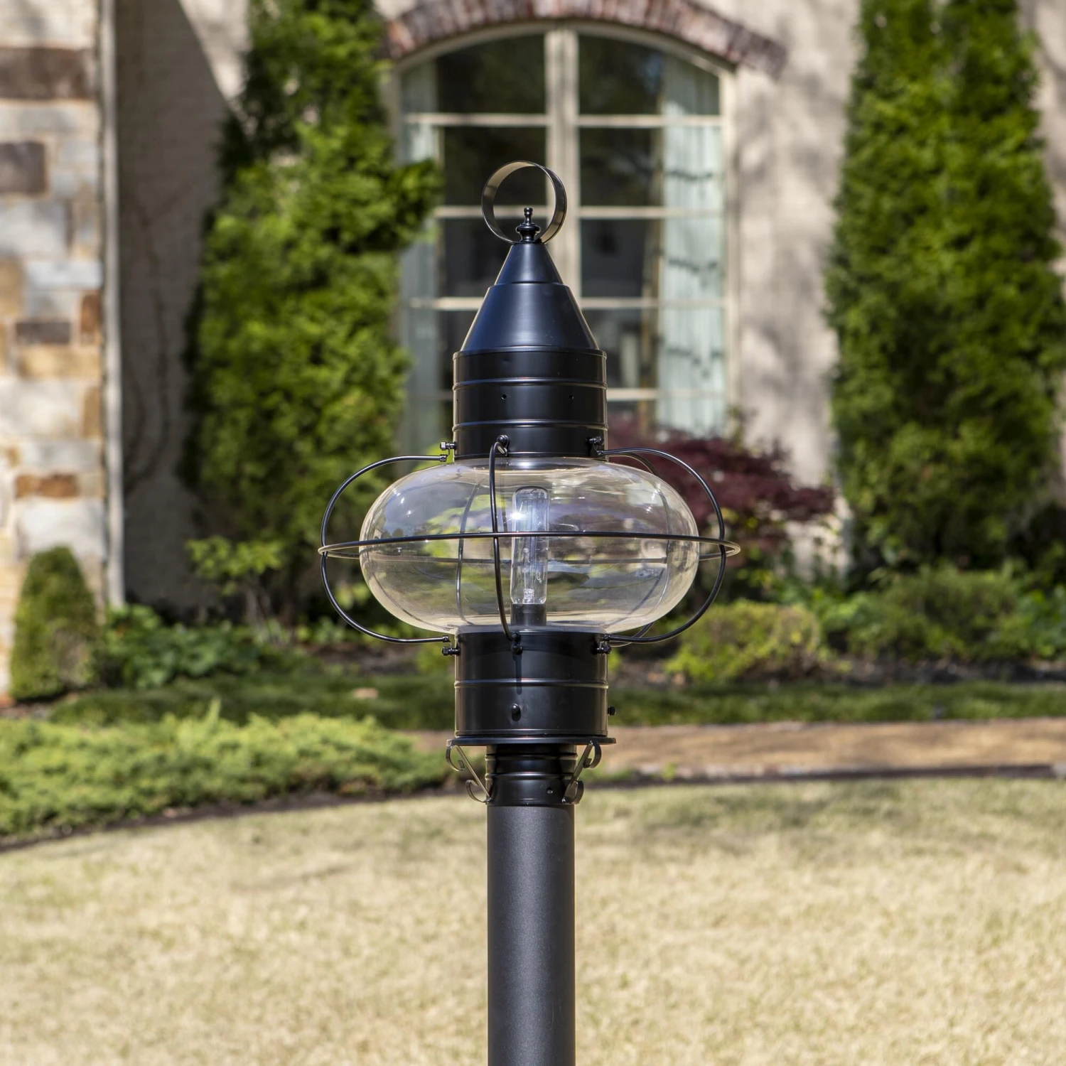 Capturing the charming essence of a New England coastal town, the iconic onion lantern silhouette enhances your exterior classic style and a warm glow. Featuring the rounded shape of an onion, the glass is encapsulated by impressive brass gridwork. Historically, the onion globe was popularized due to its durability and was widely used on fishing vessels. Clean lines of the metal roof lend a modernized feel to our vintage-inspired lantern, allowing it to compliment an array of exterior styles. Radiating light in multiple directions, this post lantern is perfect for lighting yards, driveways, gardens and outdoor living spaces. Crafted to withstand the elements of the outdoors, our 1-light post lantern tops your outdoor post with ageless style and year-round illumination.