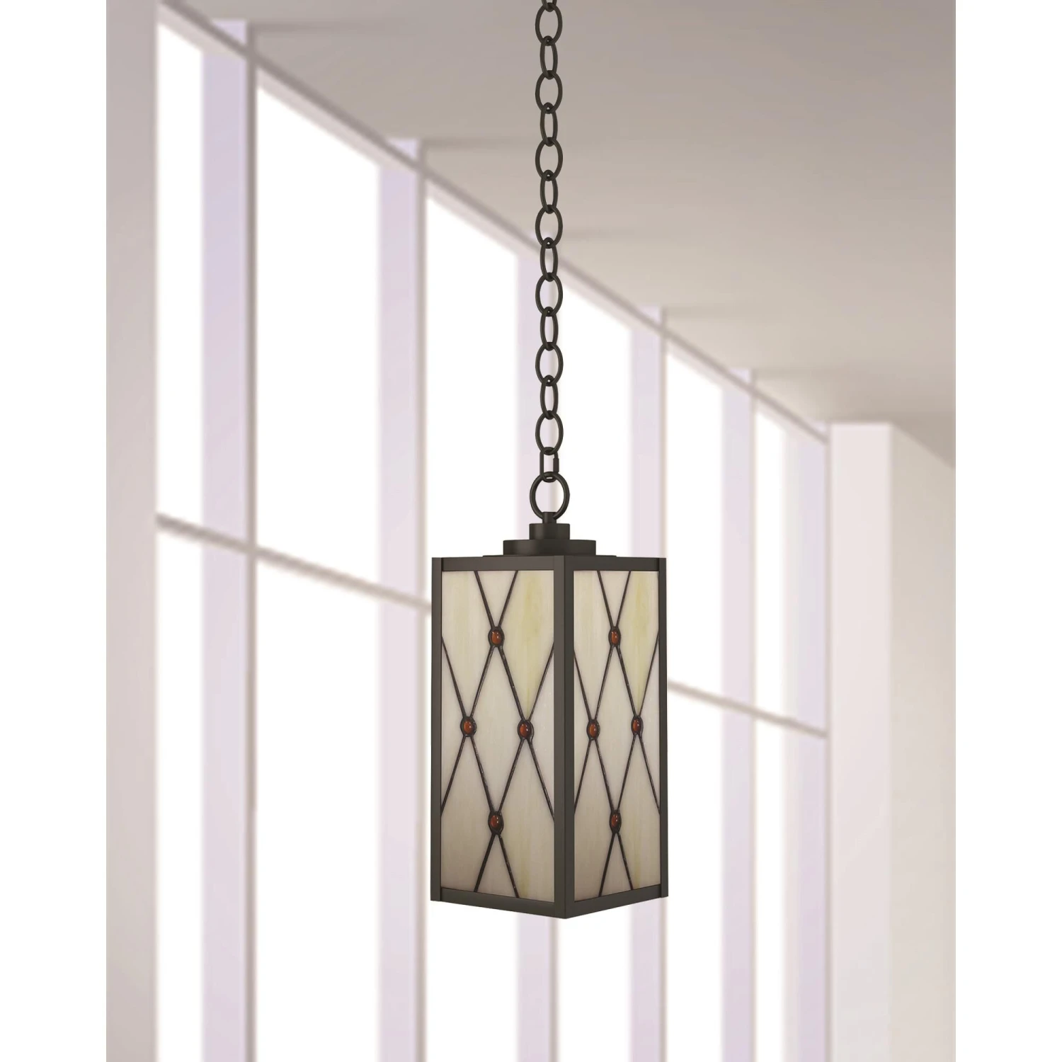 A contemporary classic, our Ory Outdoor Mini Pendant will add instant appeal to any outdoor area. The rectangular shade is crafted of large panels of frosted art glass that are encased in a metal frame. Each of the 4 sides feature a crisscross pattern that is accented with burnished amber art glass gems at each intersection that add a pop of color when the pendant is illuminated. Ory hangs from a round metal ceiling canopy and chain. All the metalwork is finished in contemporary Oil Rubbed Bronze, which complements any exterior decor. A wonderful choice for covered porches and patios, our Ory Outdoor Mini Pendant also is a delightful way to add cozy ambience to any outdoor seating area.