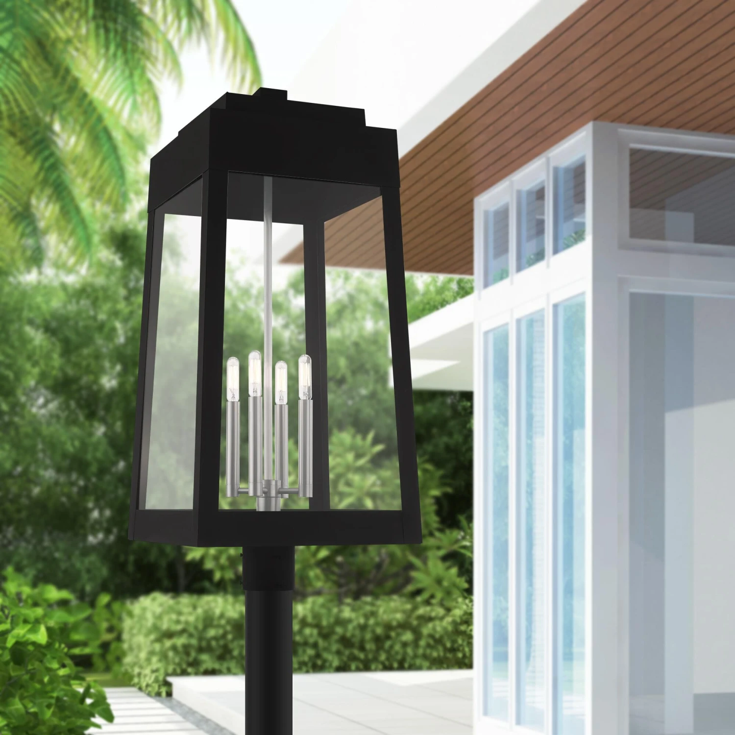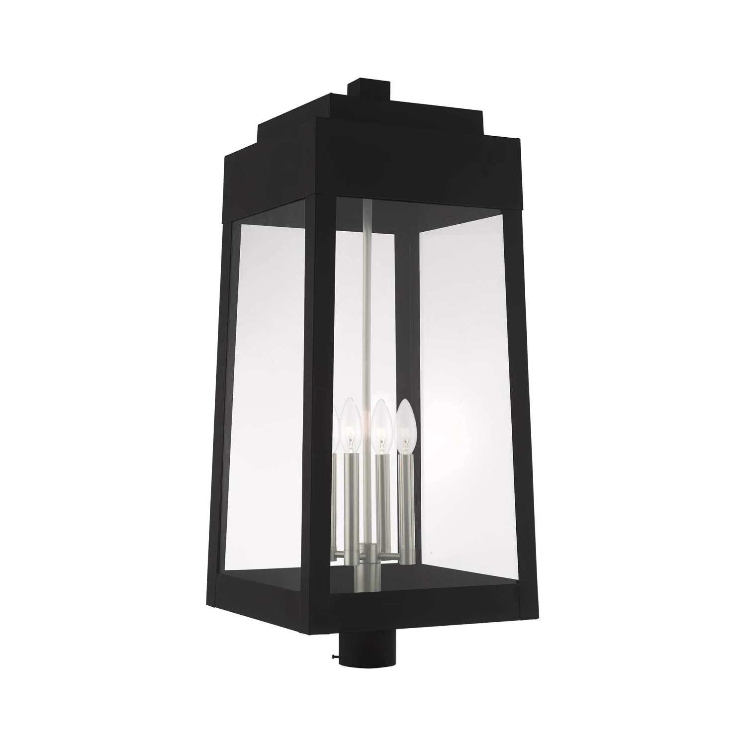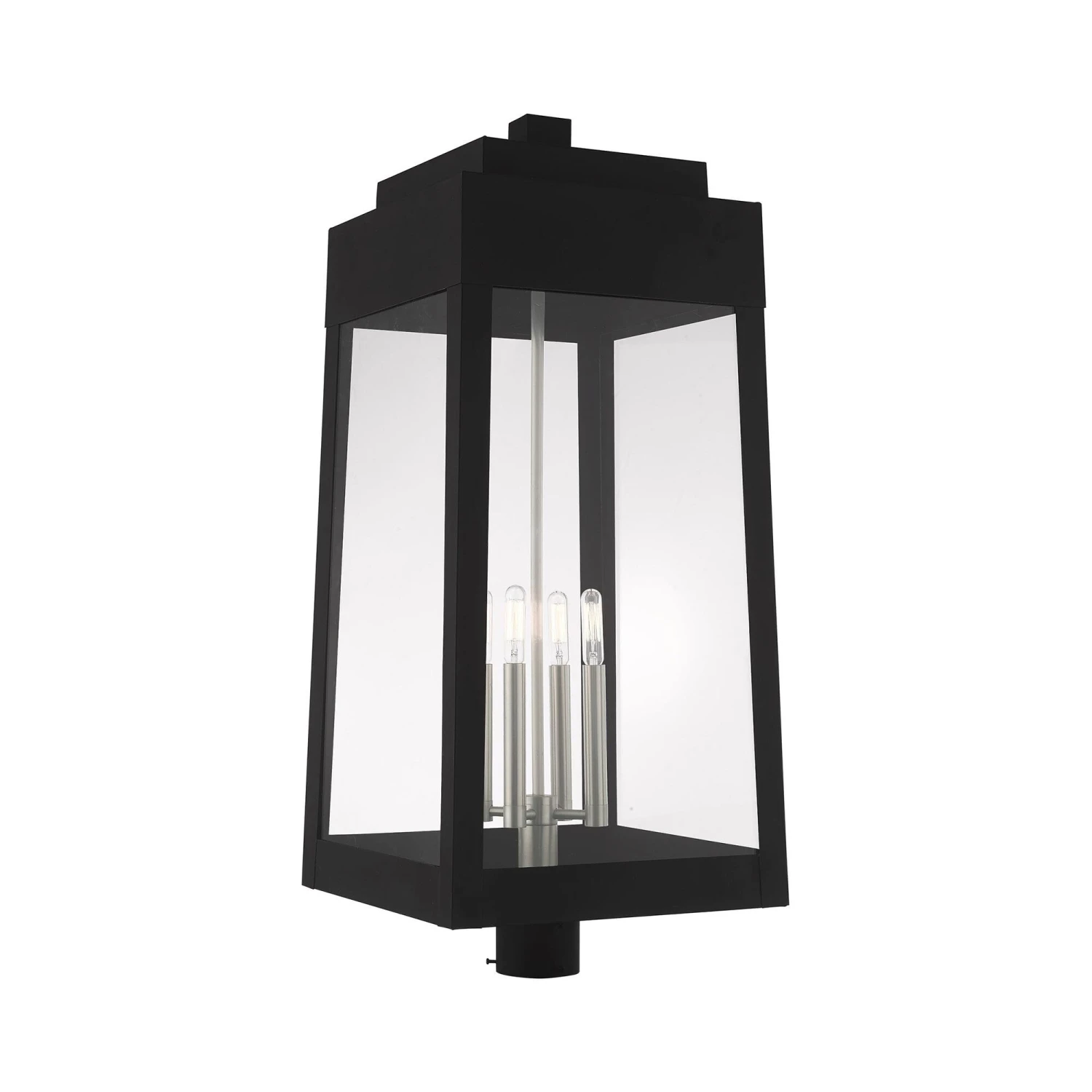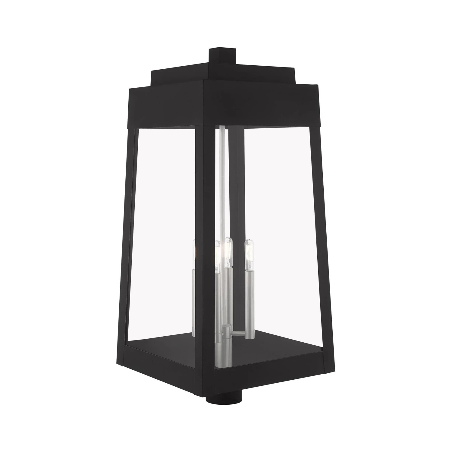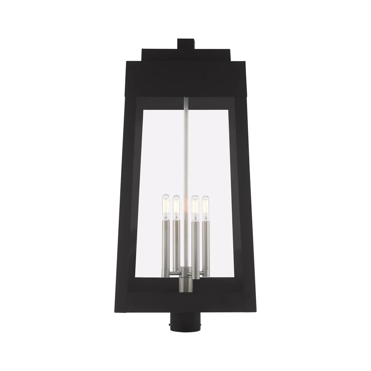 This updated industrial design comes in a tapering solid brass black frame with a sleek, straight-lined look. Clear glass panels offer a full view of the brushed nickel accents, that will house the bulb of your choice.