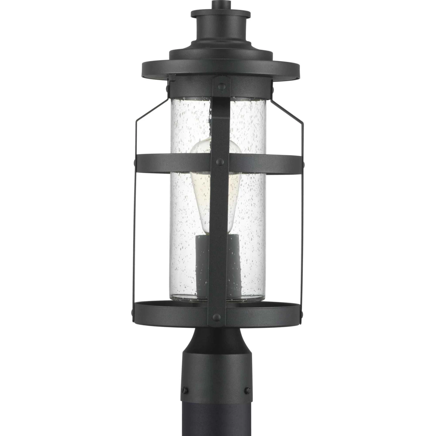 The one-light post lantern in the Haslett Collection features a design with intersecting linear details that surrounds clear seeded glass and finished in Black. Coastal-inspired frame is suitable to complement architecture with Farmhouse flair.