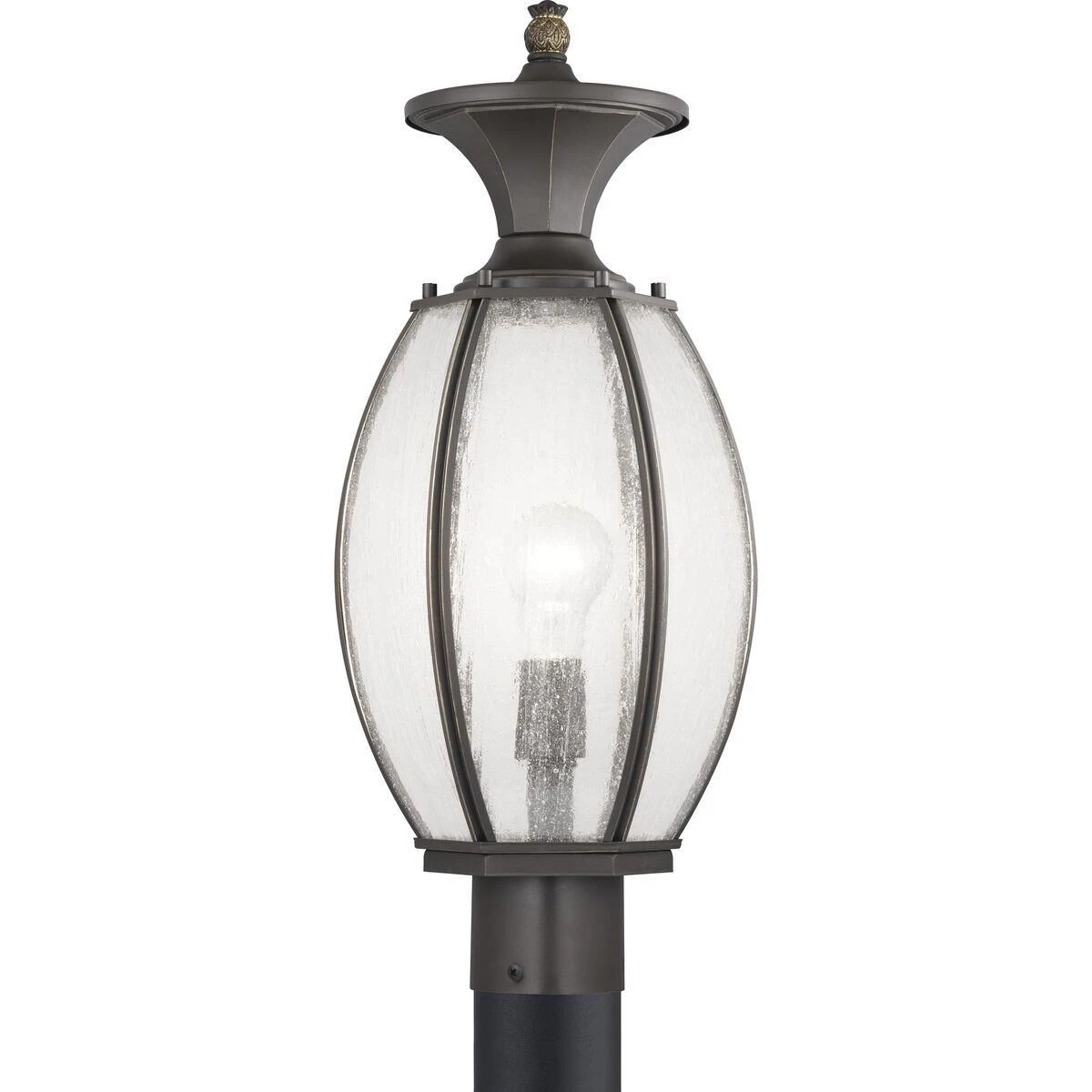River Place one-light post lantern showcases an inviting design to create instant curb appeal for the home. The clear seeded glass is topped with a flared roof, resembling the features of a pineapple, the symbol of hospitality. An Antique Bronze finish completes the lantern with a graceful touch of tradition.