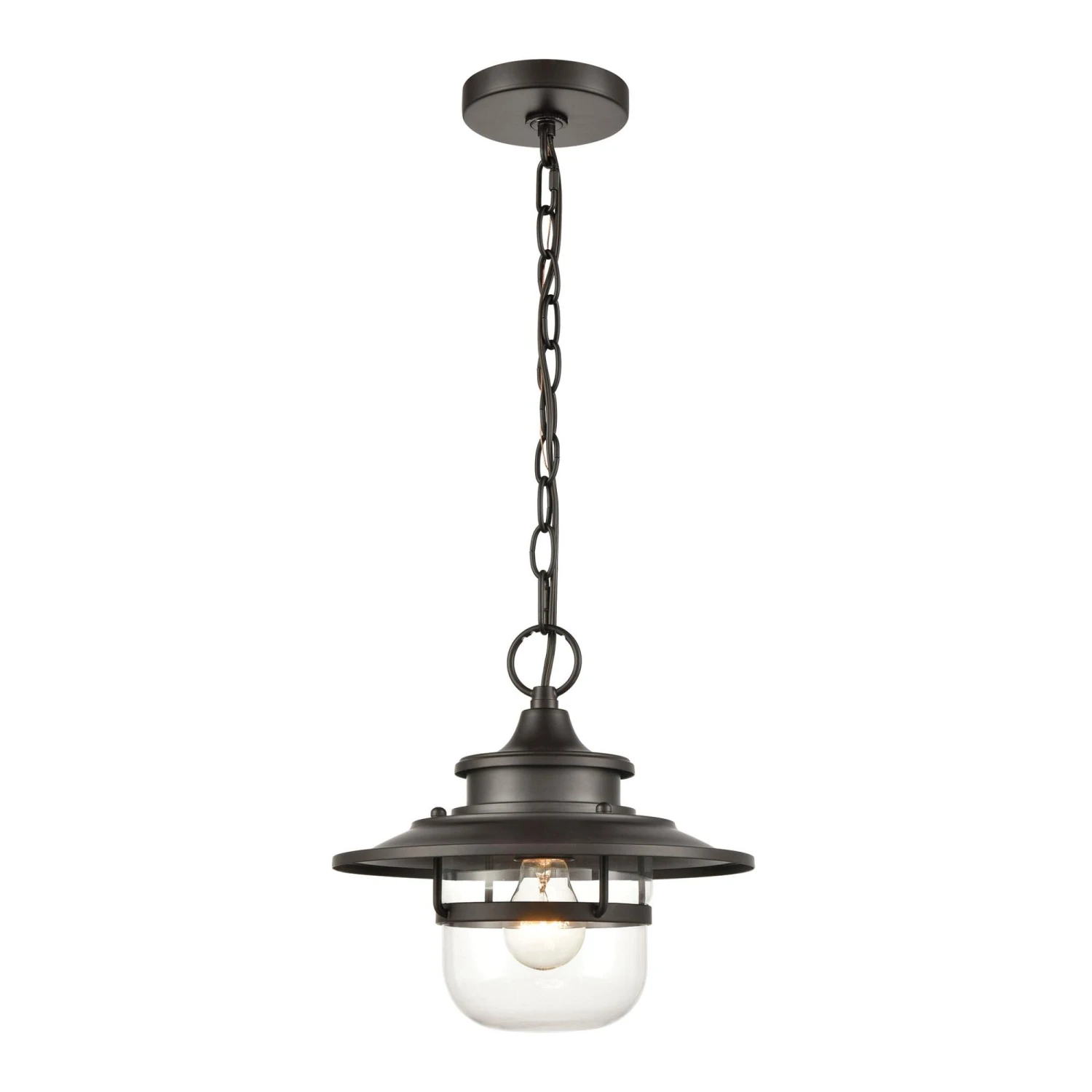 The Renninger outdoor pendant showcases a barn light design and an oversized stepped shade. The clear glass diffuser is nestled inside the metal frame, which is finished in oil rubbed bronze.