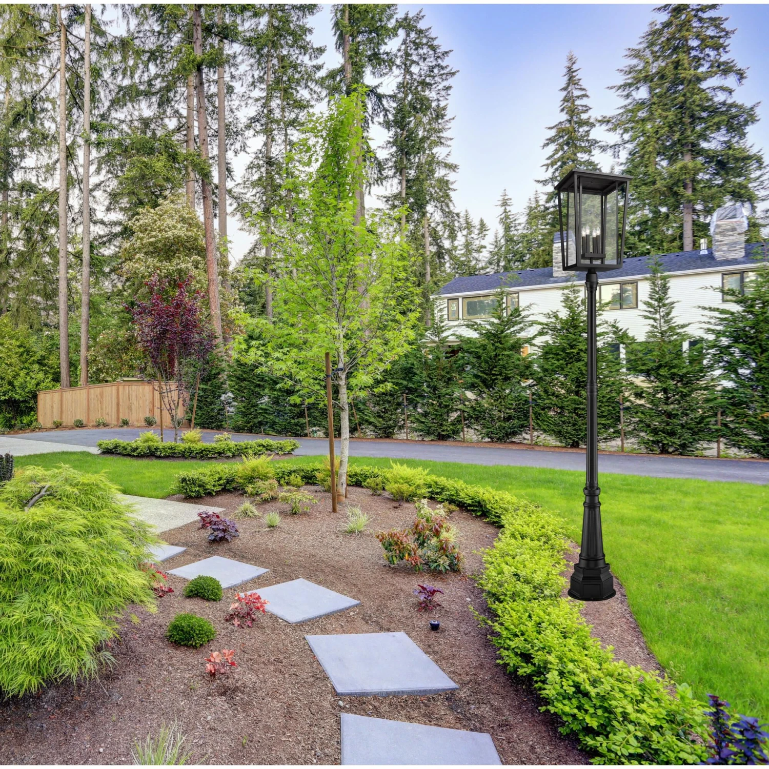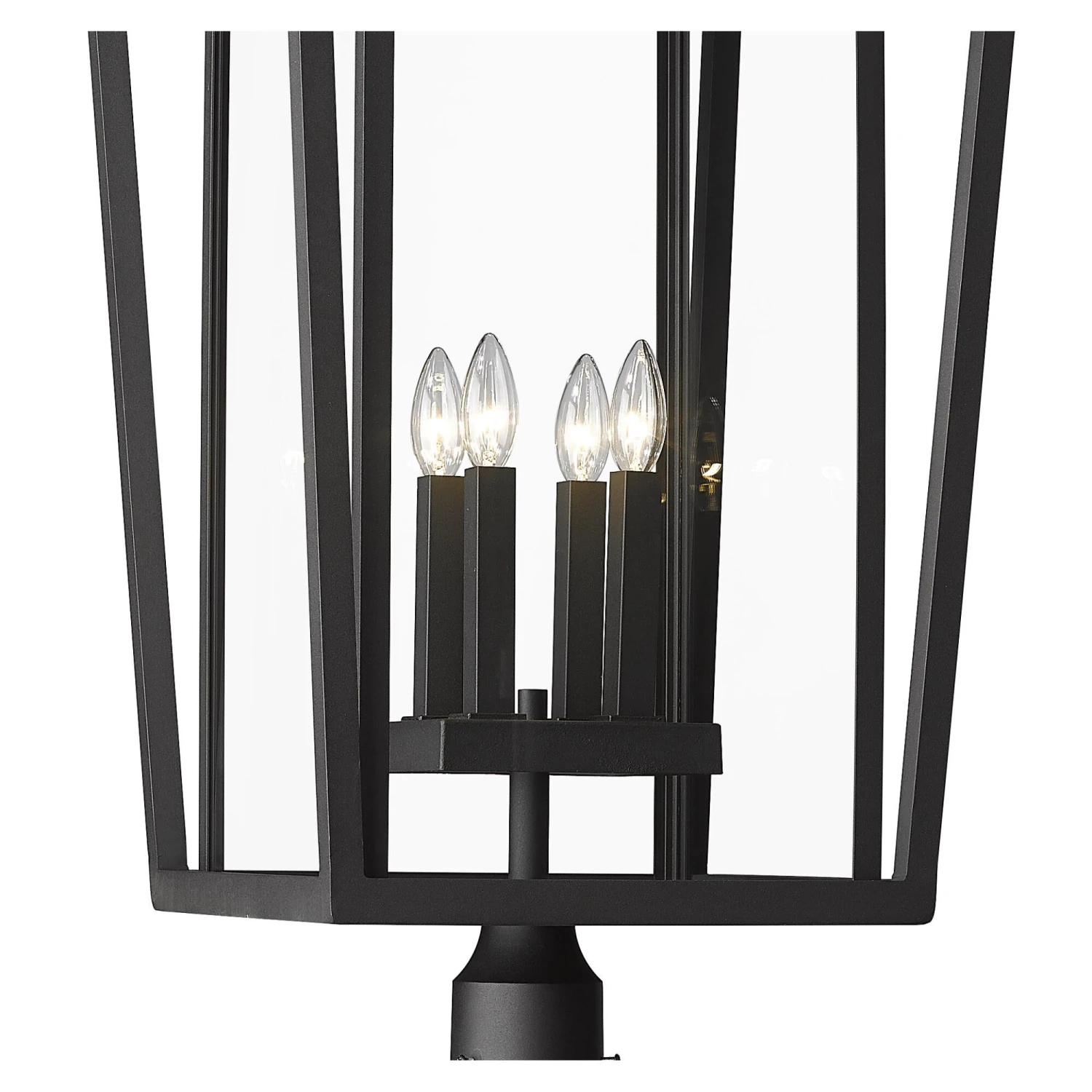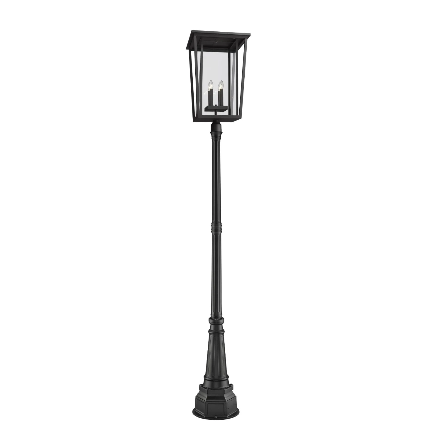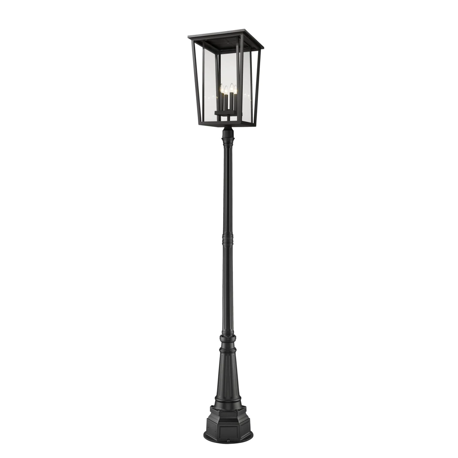 This four-light outdoor post-mounted fixture creates a cool mix of old and new. From the Seoul collection, this extraordinary light offers a geometric-inspired black finish aluminum fixture with geometric lines and specially cut clear glass. An elegant post creates the perfect venue to showcase this elegant light.