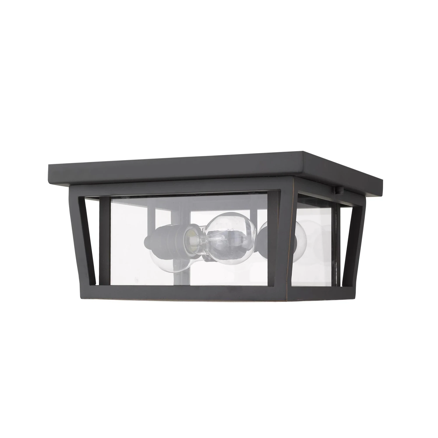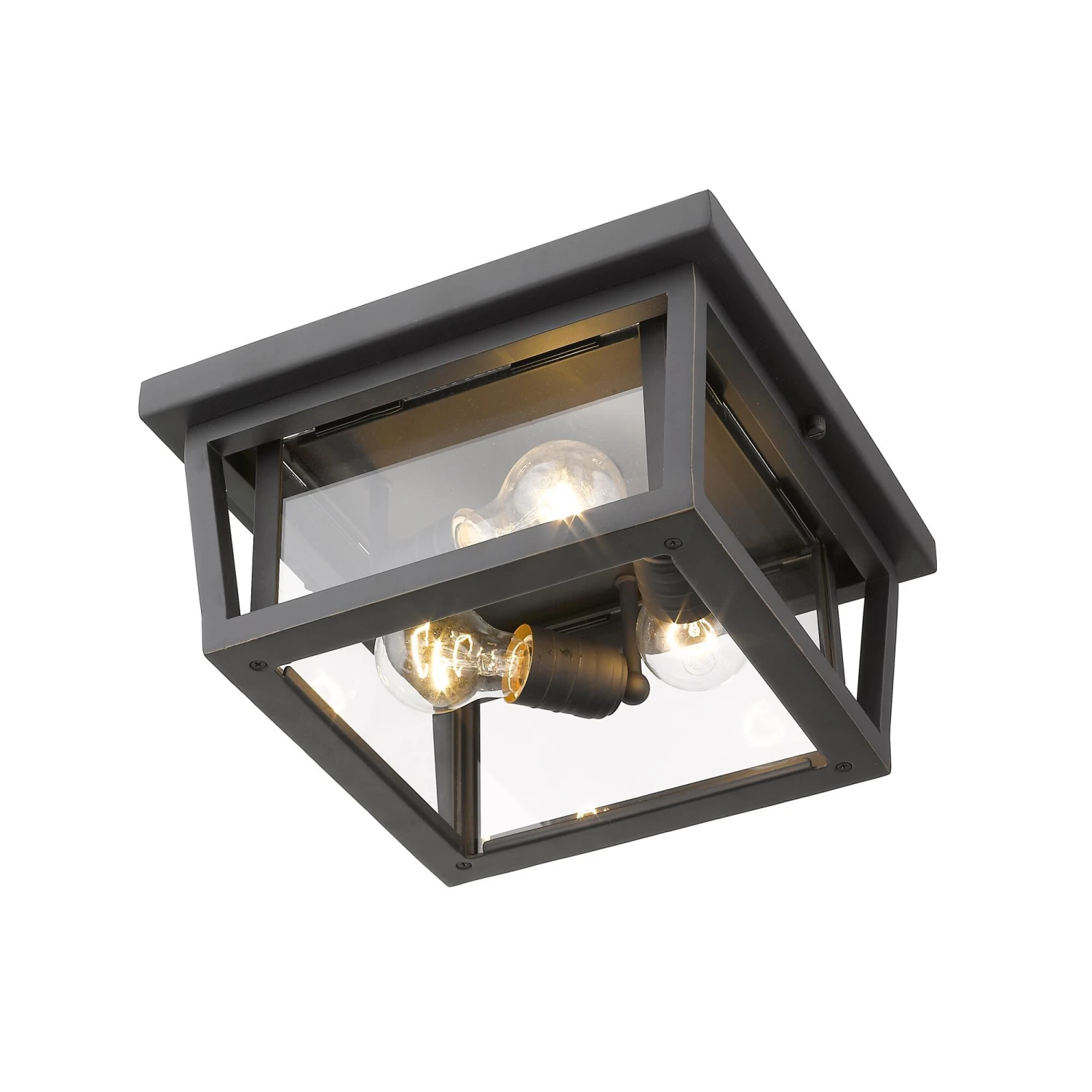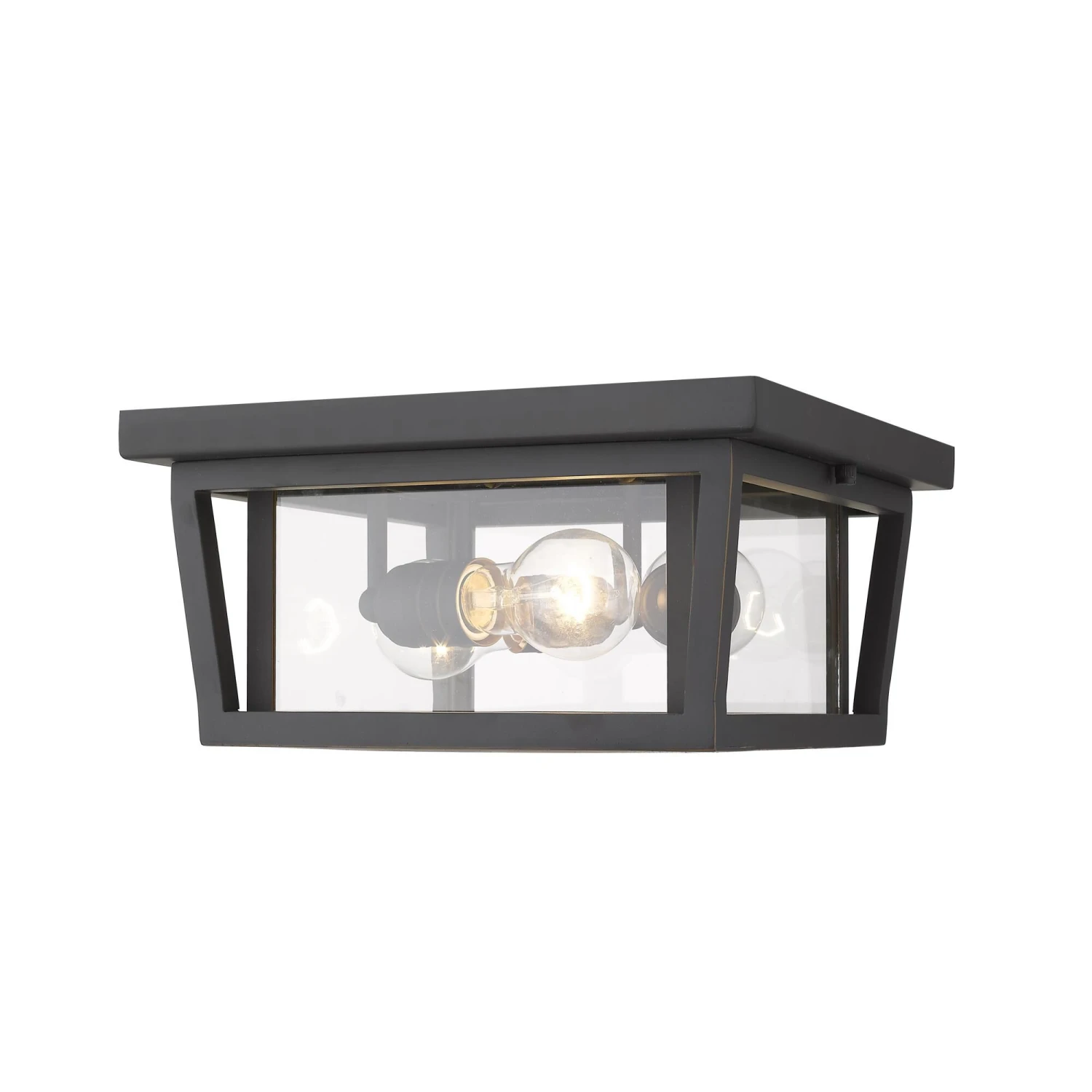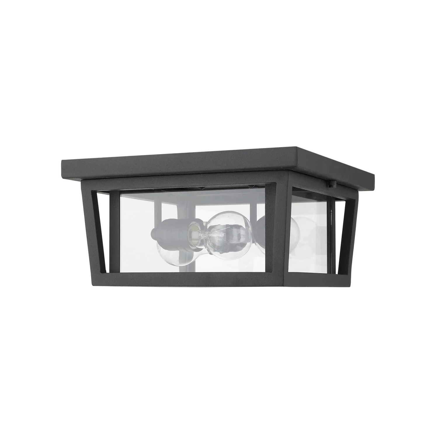 Offer lighting from above in a gazebo or deck space. Flaunting softened geometric design elements, this black finish flush mount outdoor lantern light features charming bulbs tucked behind a clear glass shade.