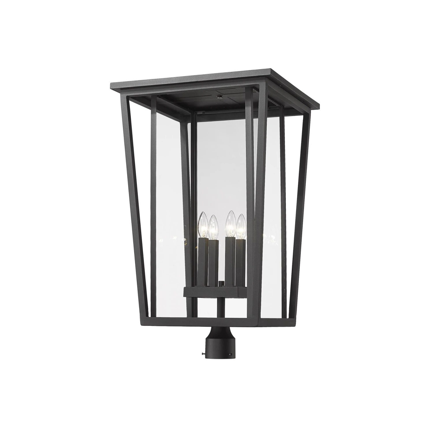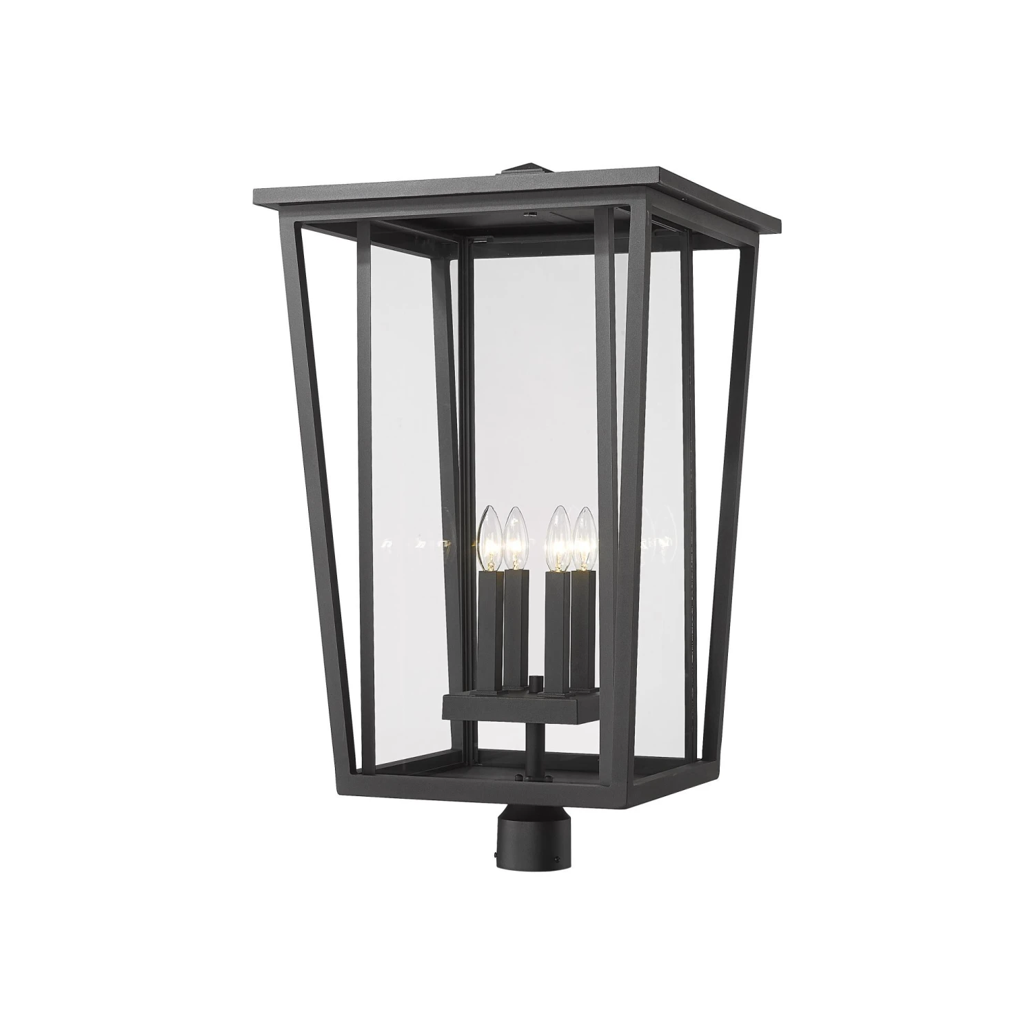 Top an exterior light post with a fixture that blends geometric energy with charming village-inspired essence. This four-light post mount fixture from the Seoul collection infuses minimalist geometric style in a black finish aluminum frame with angled accents. Specially cut clear glass panels offer a perfect view of a four-bulb base inviting romantic candelabra-style bulbs.