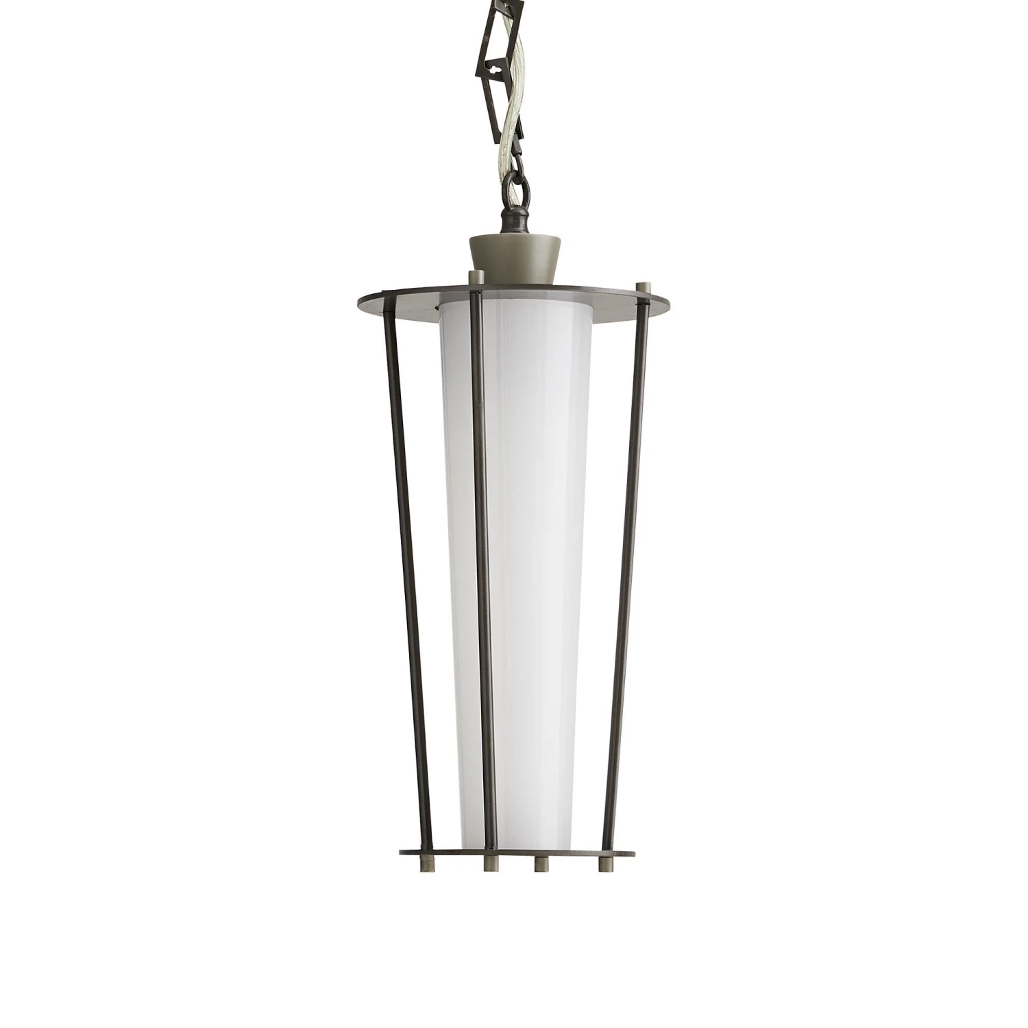 This handsomely structured lantern is upscale in form and style. It is made from aged iron finished steel tapered in form and designed with slight exposed details and contrasting nickel finish accents to exude an industrial feel. A sleeve of opaque opal glass rests inside filtering the light from a standard bulb. Additional chain available (CHN-191). Approved for use in outdoor areas.