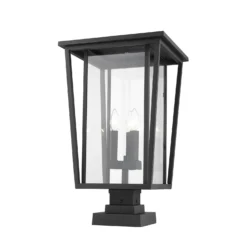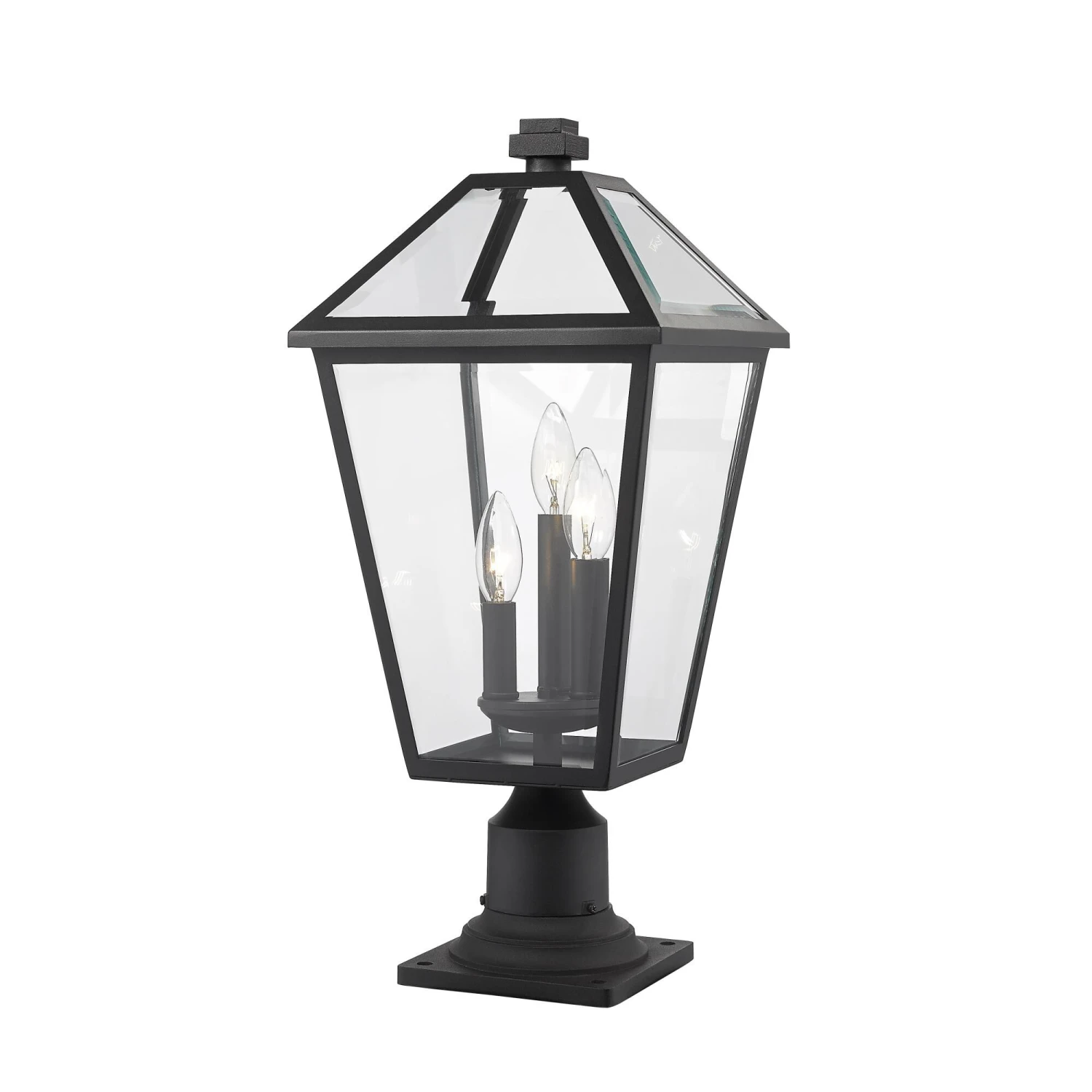 Illuminate an exterior front or back walkway with a classic fixture reflecting a charming village theme. Made from Midnight Black metal and clear beveled glass panels, this three-light outdoor pier mounted fixture delivers a charming upgrade with industrial-inspired attitude and a silhouette that’s perfect for lower-level gardens and walkways.