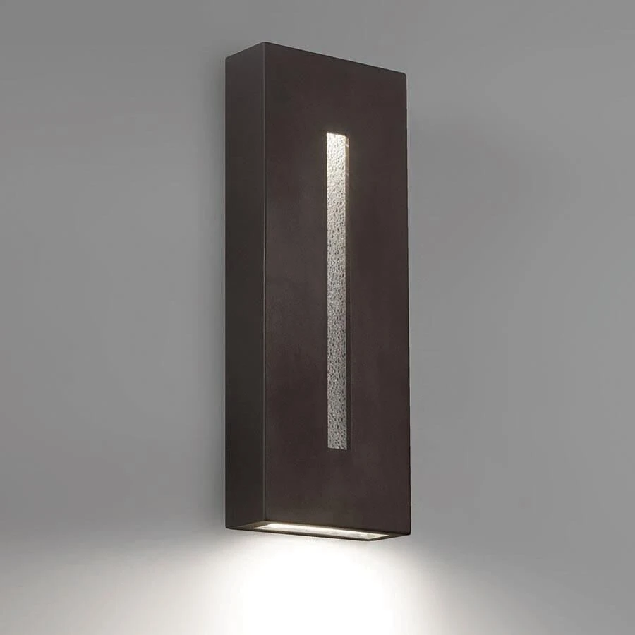 Architecturally harmonious form gravity cast from aluminum for structural durability. The architectural design features a sliver window of glass with an optical pattern for visual interest. Effective down lighting integrated for illuminating pathways.Wet location listed and ADA compliant for interior or exterior installations. Down light adds functional path lighting.