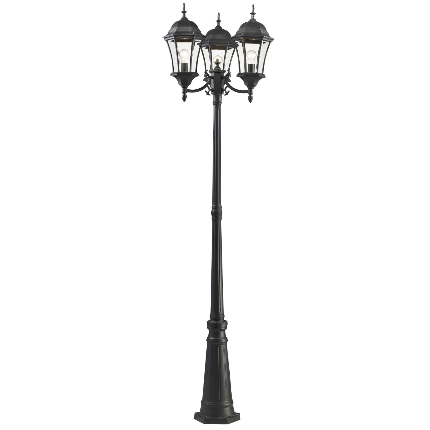 For a bold look, this three-lantern post light is sure to please. Using bold detailing finished in black, and clear beveled glass for a bright spill of light, this fixture is sure to create a unique and bold statement. These fixtures are made of aluminum for years of durability. All posts lights come complete with mounting templates, bolts, and cap nuts.