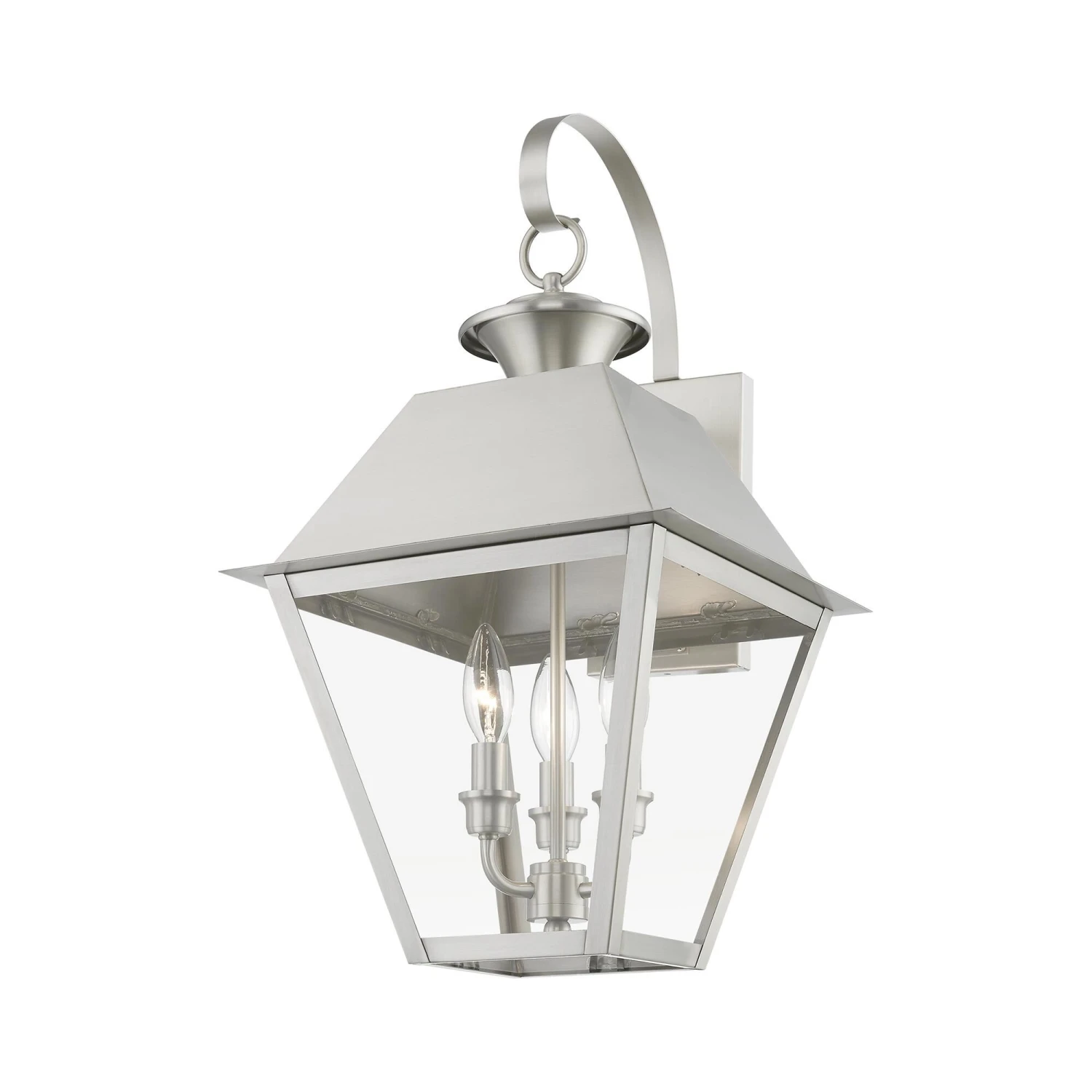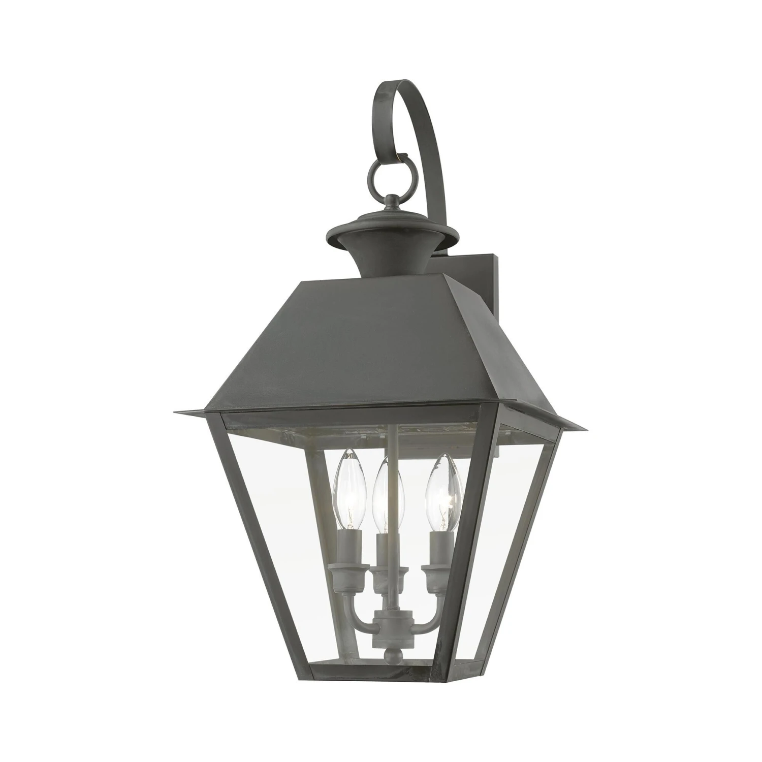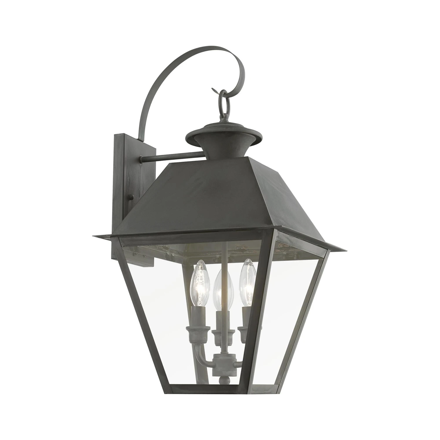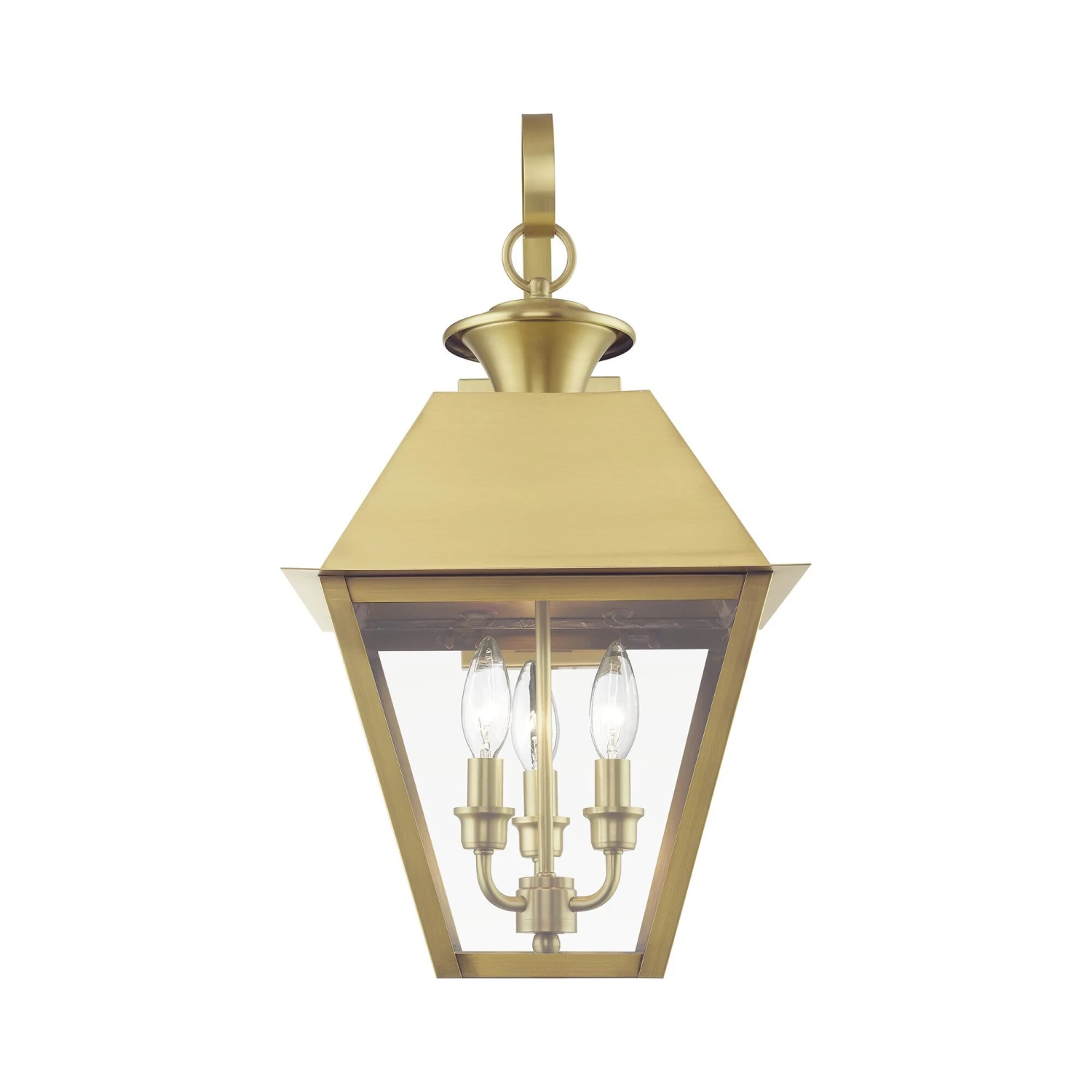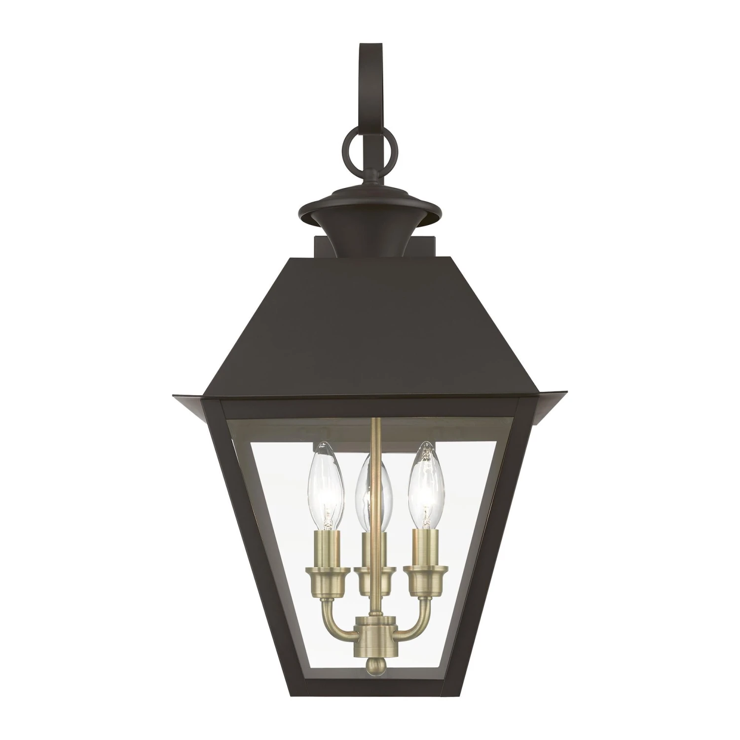 With its appealing bronze finish and clear glass, the stunning Mansfield collection will make an elegant addition to any outdoor space. Formed from solid brass & traditionally inspired, this downward hanging three-light outdoor large wall lantern is perfect for a back porch or entry way. Combining superb craftsmanship and affordable price, this fixture is sure to be a timeless addition to your home.