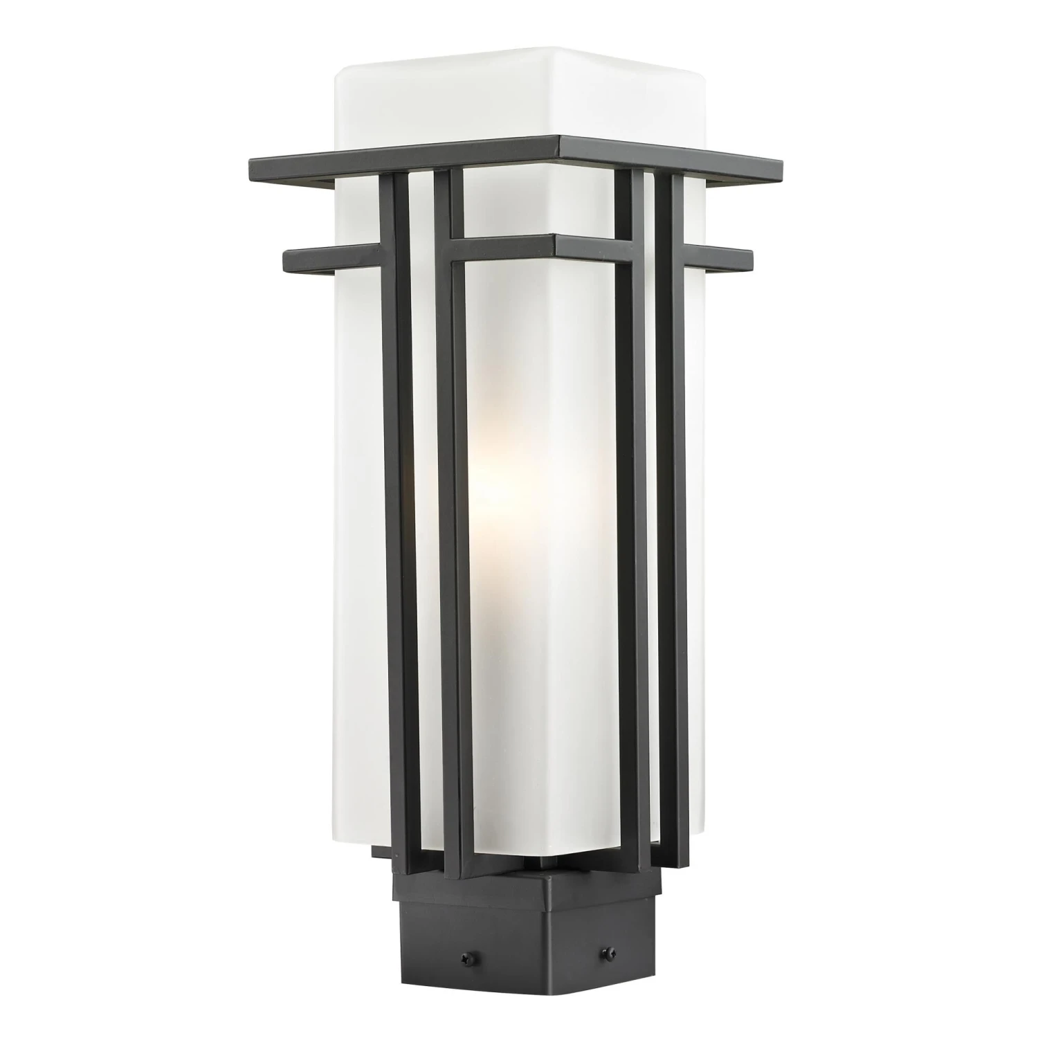 The geometric lines of the Abbey family combine well with contemporary home styling as well as homes in the craftsmen style. This medium outdoor post head fixture is made of steel and finished in black with matte opal glass.