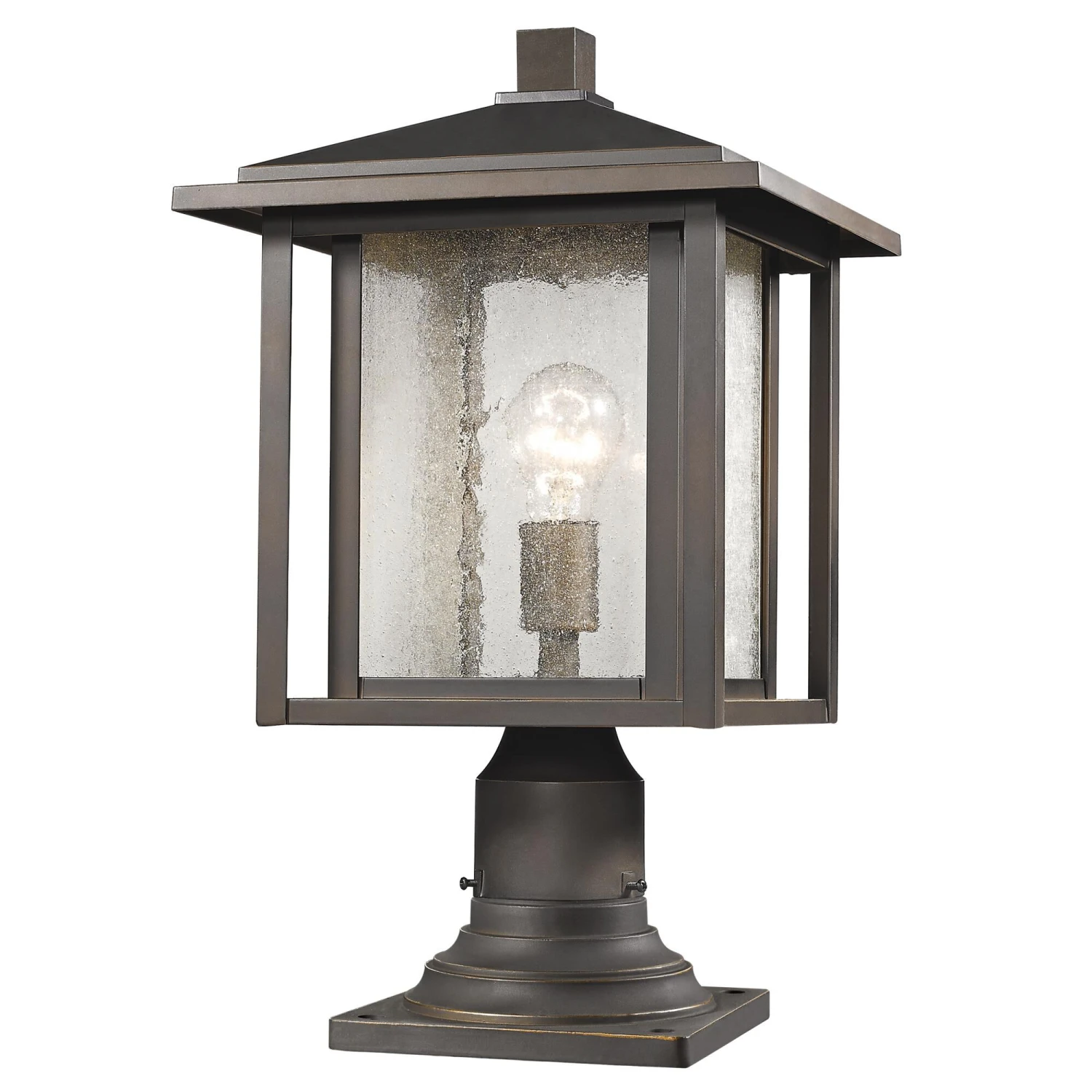 With its sturdy dual frames encasing uniqueseedy glass panels, the Aspen collection exudes a classic craftsmen style that is bold yet charming. Available in Black or Oil Rubbed Bronze, these fixtures will accent any outdoor setting.