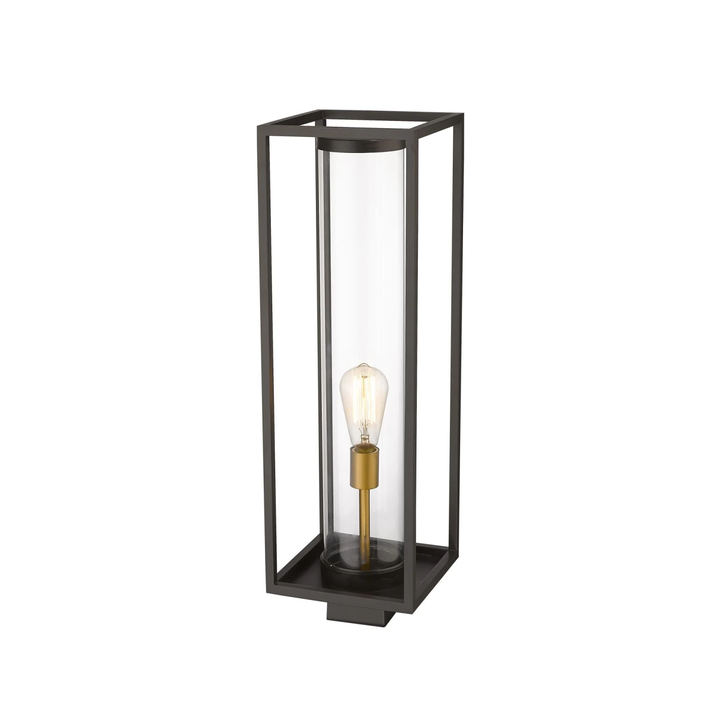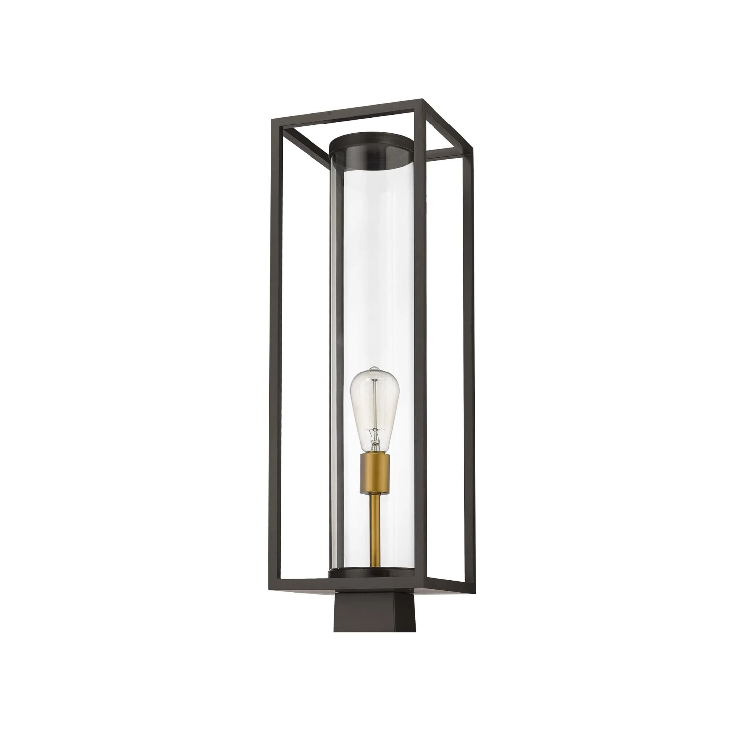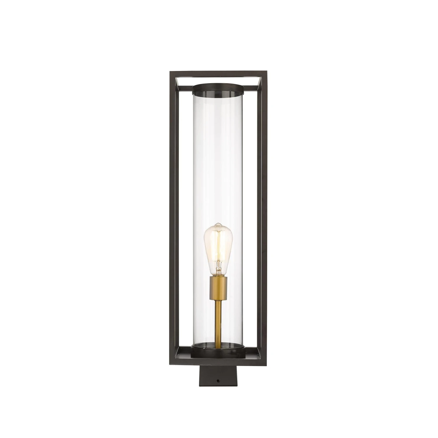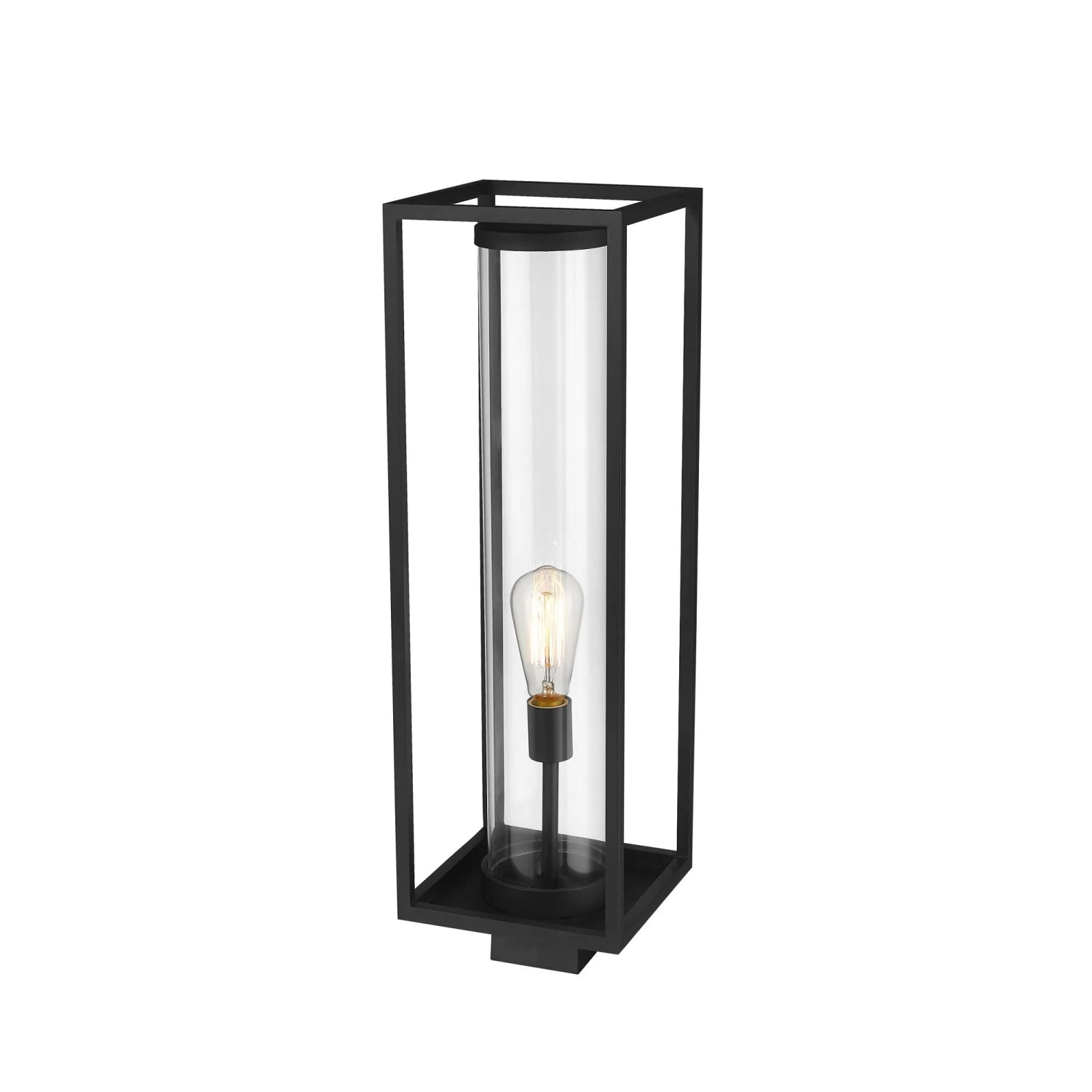 Shed a comforting glow on your exterior entertainment areas with this contemporary outdoor post mount from the Dunbroch collection. Mount this light fixture to deck railing or posts scattered around the landscape, lending a modern vibe to the home with its open, airy rectangular aluminum lantern. This outdoor light fixture also features a dark black frame finish that works with any facade colors and materials, along with a single light encased within a clear, tube-like glass globe.