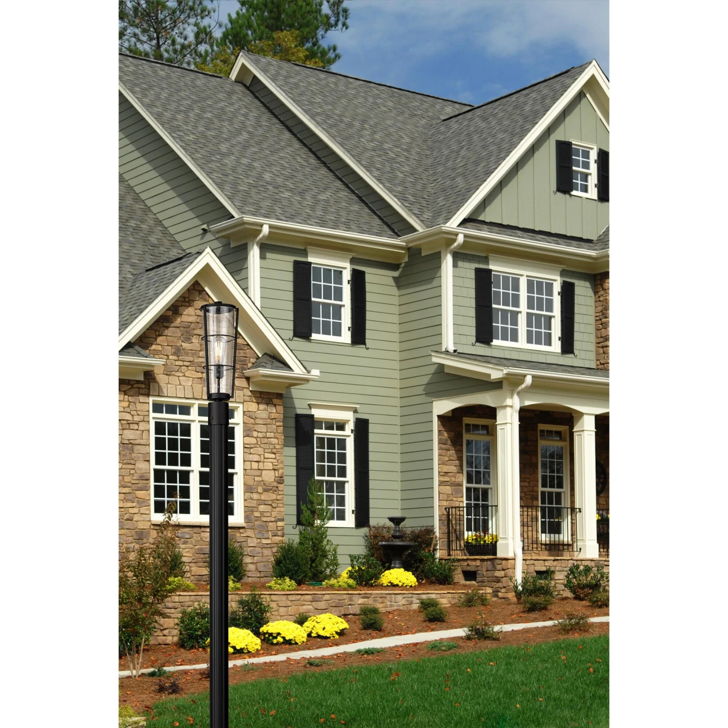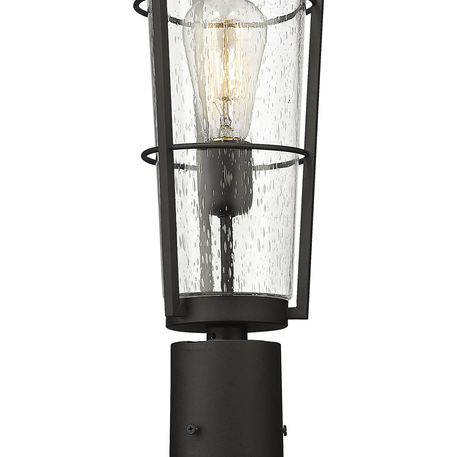 The slender silhouette of this one-light outdoor post-mounted light delivers a sense of sophistication perfect for a custom exterior space. With a post and light frame made of hand-worked black finish aluminum, this light from the Helix collection reflects a narrow lantern motif with an ornate base and a romantic conical shade made of clear seedy glass.
