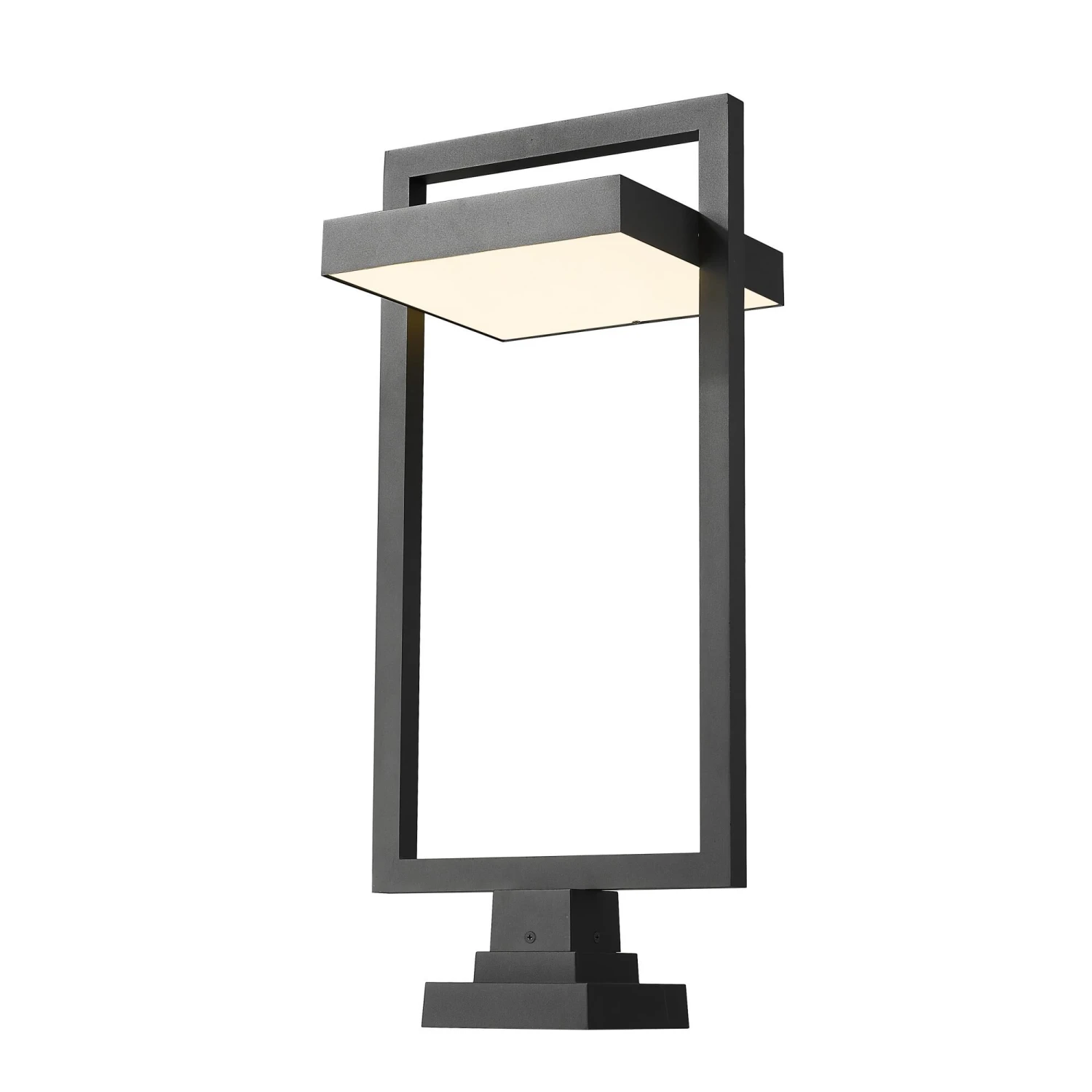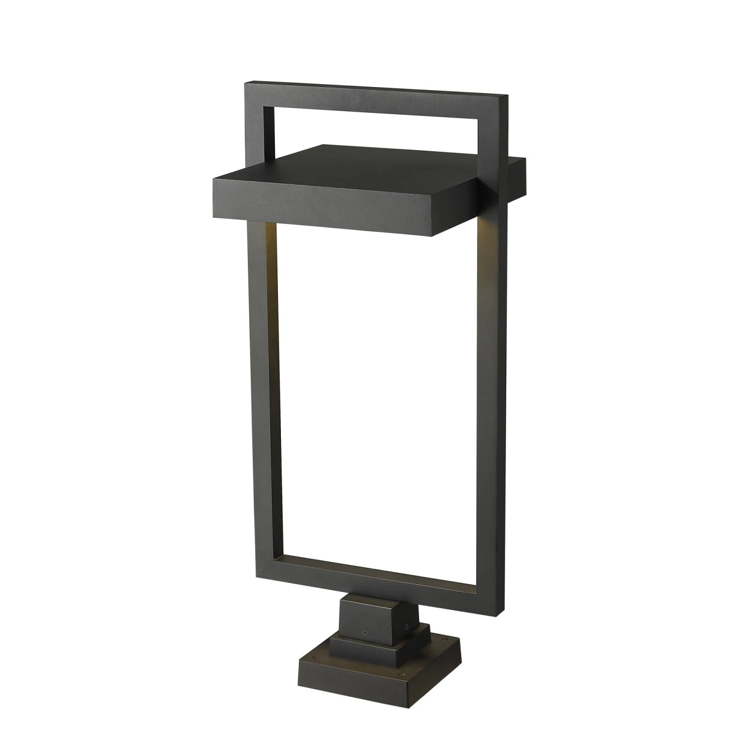 A cutting-edge solution for illuminating your contemporary patio, deck or garden area, this one-light outdoor pier mounted fixture delivers chic minimalism with its angular bold black finish aluminum frame. A sand blast finish white glass shade uses LED-integrated technology to provide a strong, energy-efficient glow to light up evenings outdoors. The light is supported by a sturdy two-tiered base.