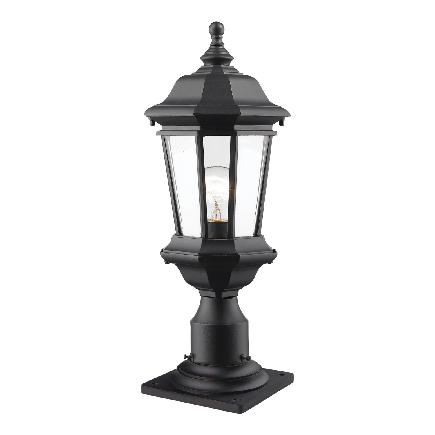 The traditional styling of the Melbourne family of lanterns is created by the gracefully curving arms complimented with the clear beveled glass. The fittings and fixtures are constructed of high quality cast aluminum and finished in black.