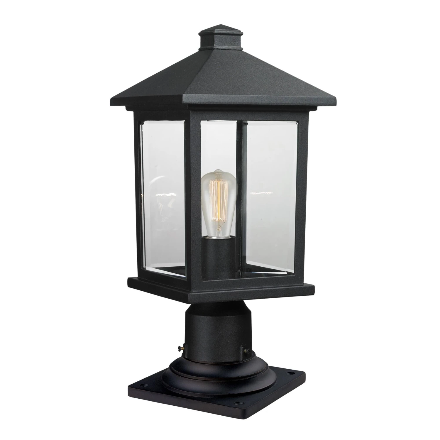 The timeless, mission styling of the Portland family displays clean lines to suit both contemporary and traditional decors. Clear beveled glass paired with black comprised of cast aluminum which withstands natures seasonal elements.
